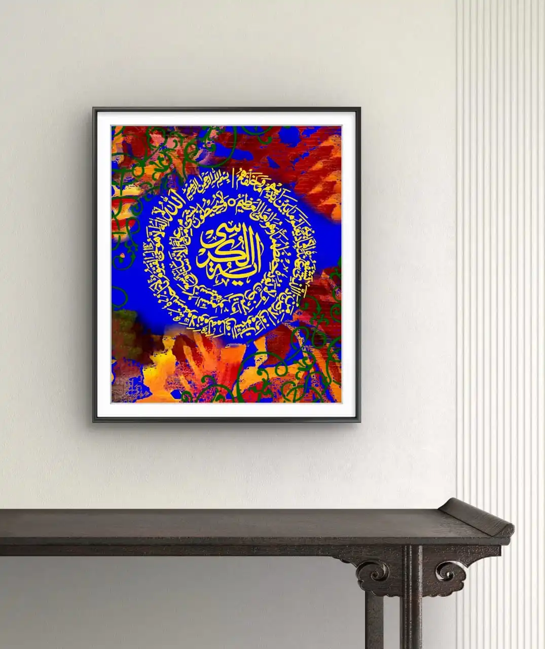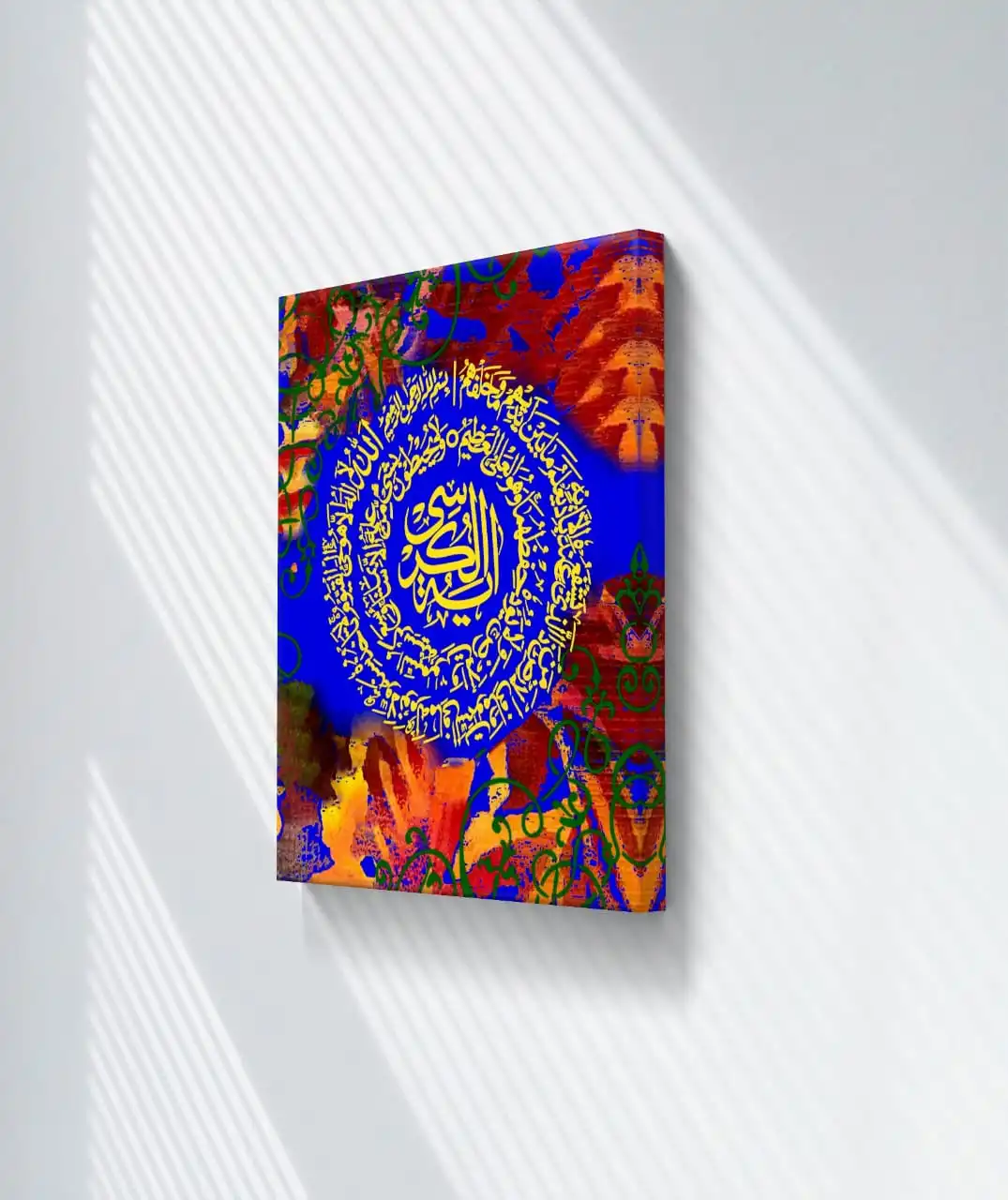Handmade Ayat al Kursi calligraphy canvas featuring refined Arabesque patterns. Printed on premium cotton canvas with multiple framing options.