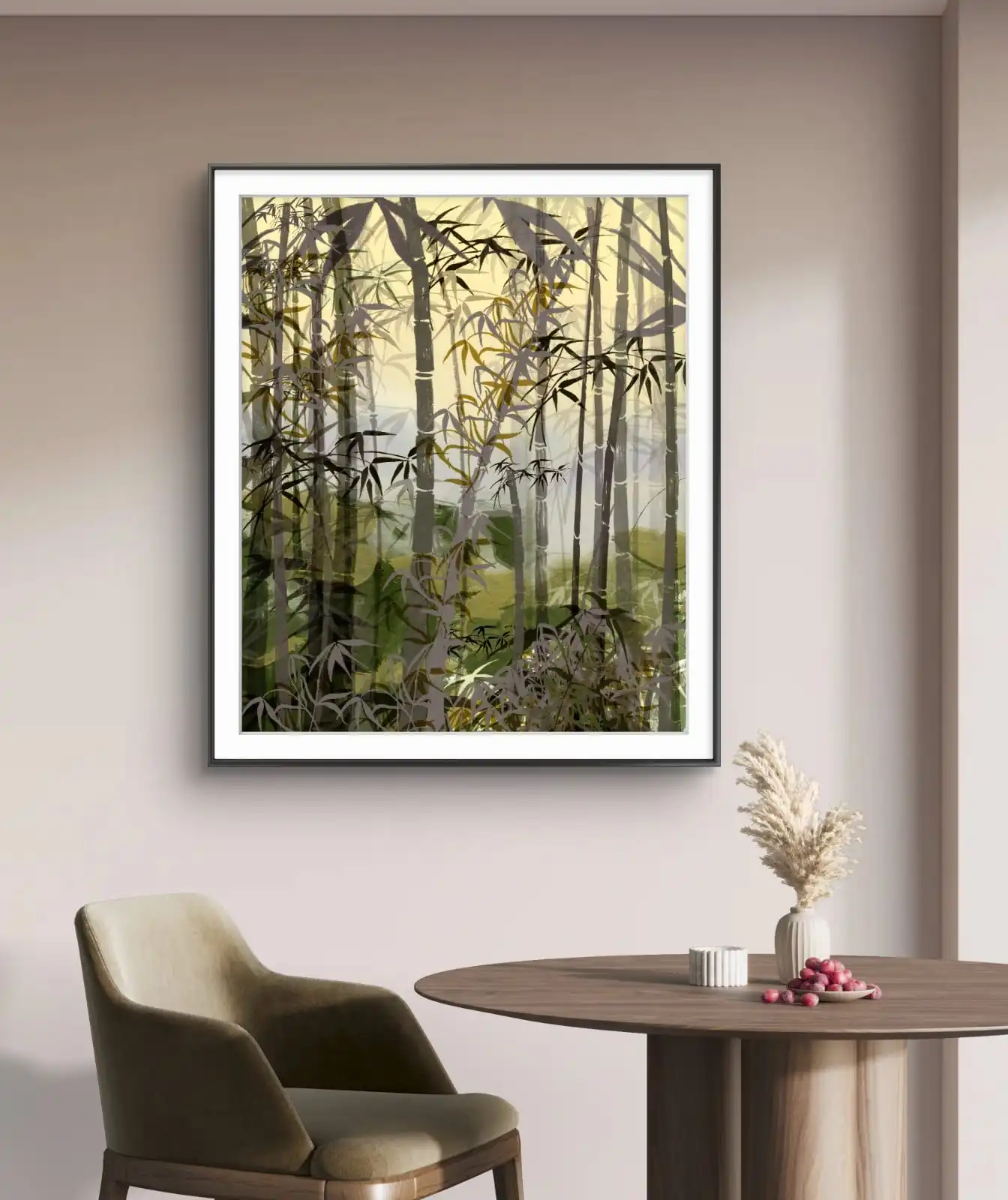 Bamboo Forest is a soothing landscape painting that brings fresh green energy into any space. This fine art print on cotton canvas comes in classical framed, gallery wrap, and unframed options. Signed by the artist and ideal for gifting or décor.