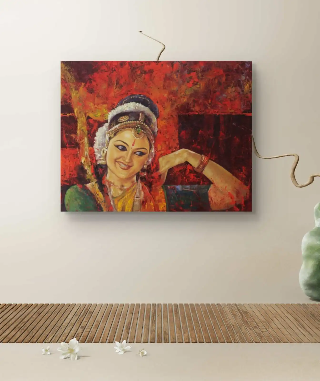 Bharatanatyam V Oil Painting is a 24×30 original handmade oil on canvas by Ashish Mondal. A vibrant contemporary artwork inspired by Indian classical dance. Signed and certified.