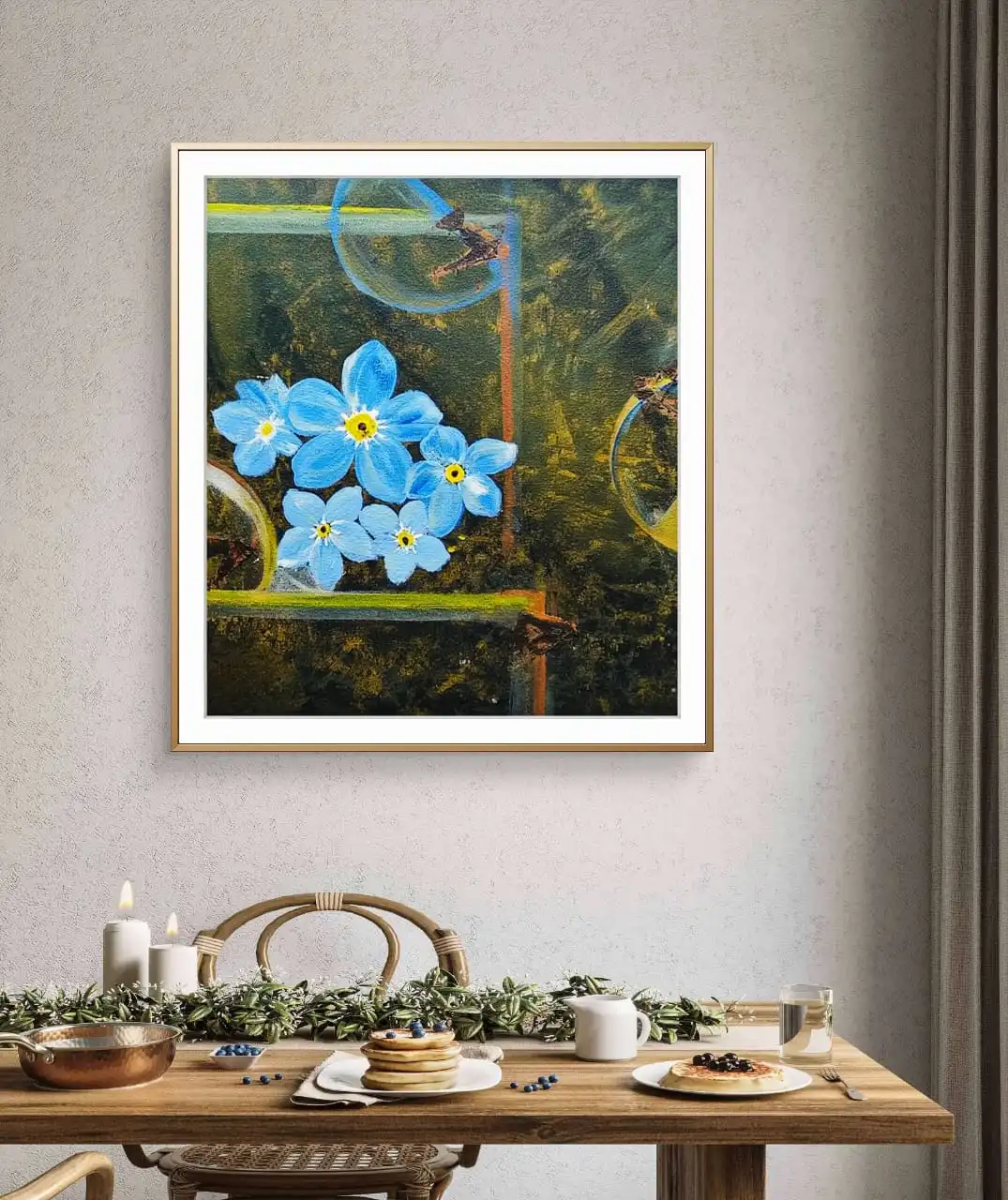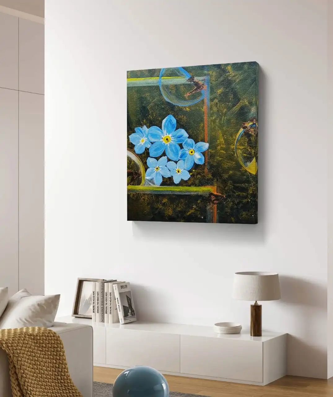 Sky Bloom Harmony is a blue floral painting that shows bright blossoms on a textured green background. Soft sky colors add freshness, and subtle abstract details give depth. The artwork feels calm yet modern, making it easy to place in different spaces.