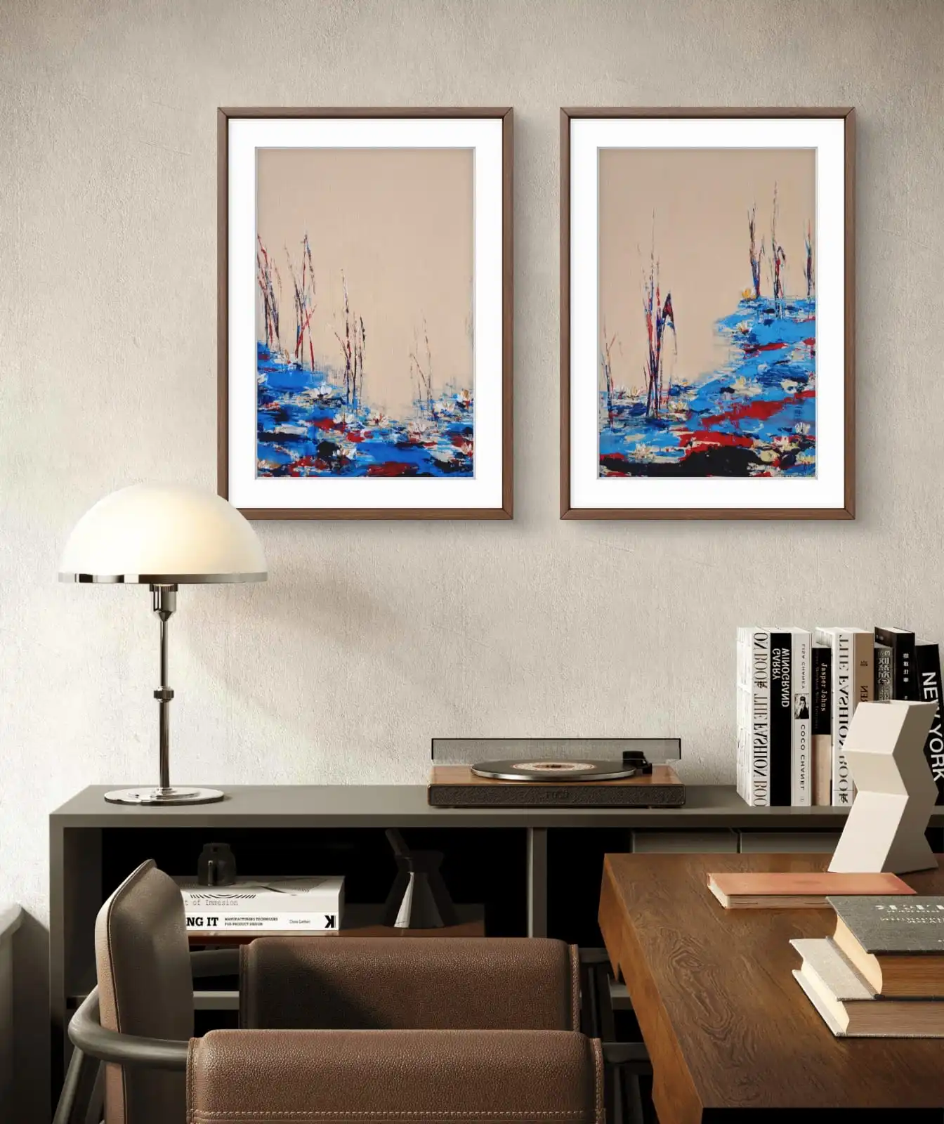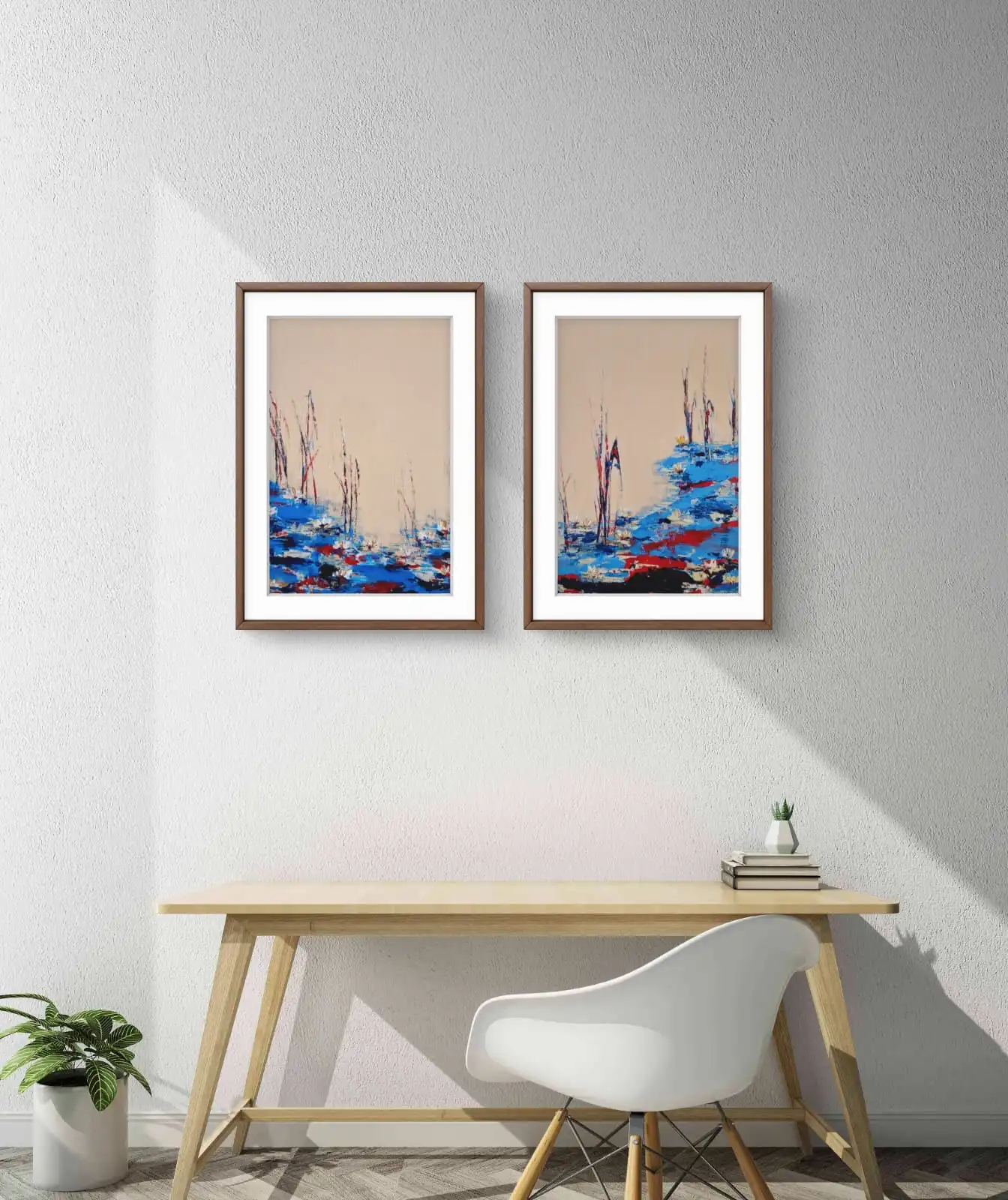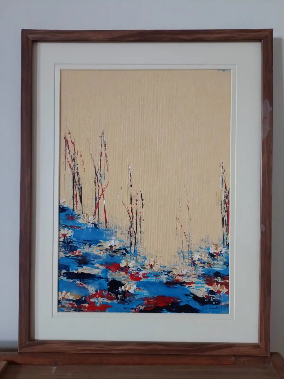 Blue Water Lily Pond is a set of two original artworks by artist Sabiha Hasan Sumbul. The paintings show a quiet pond with water lilies and tall reeds. Deep blue tones create movement across the water. Light reflections add depth to the scene.