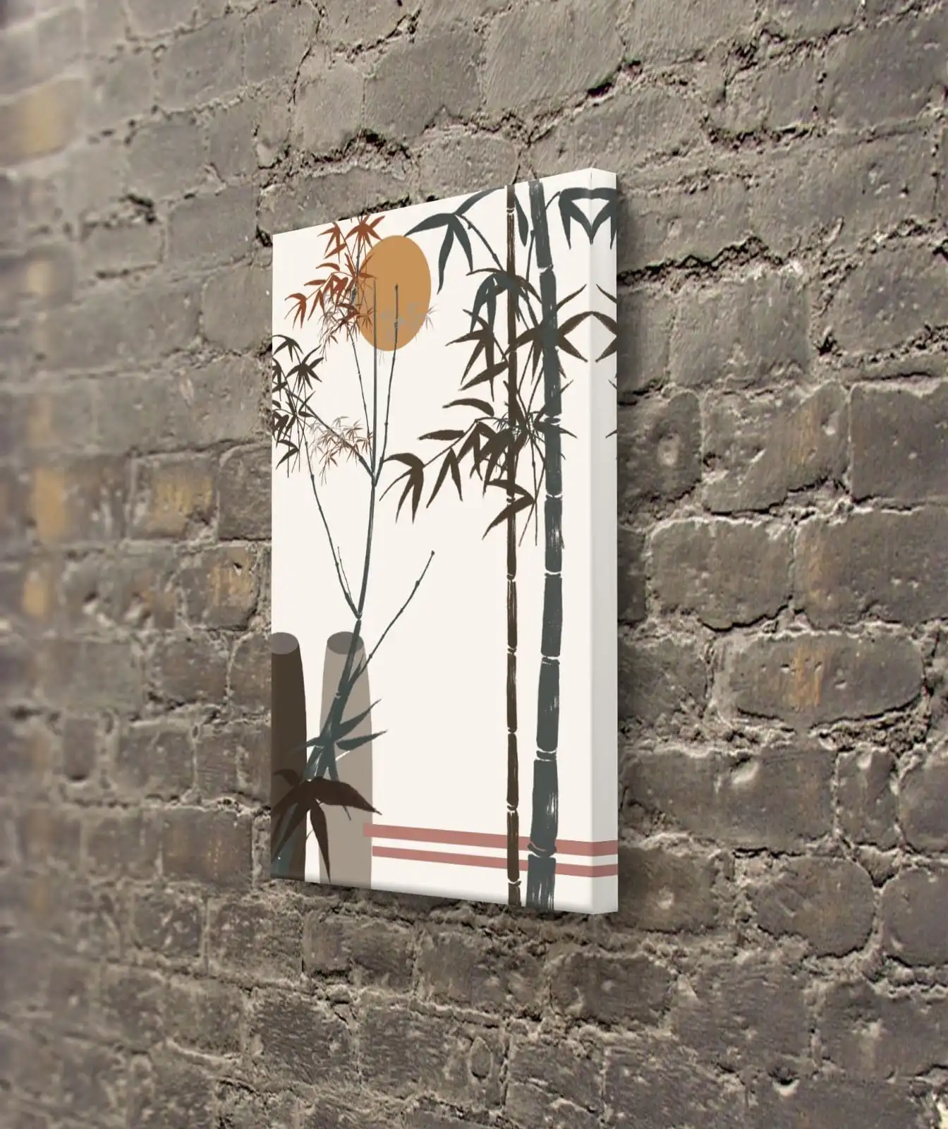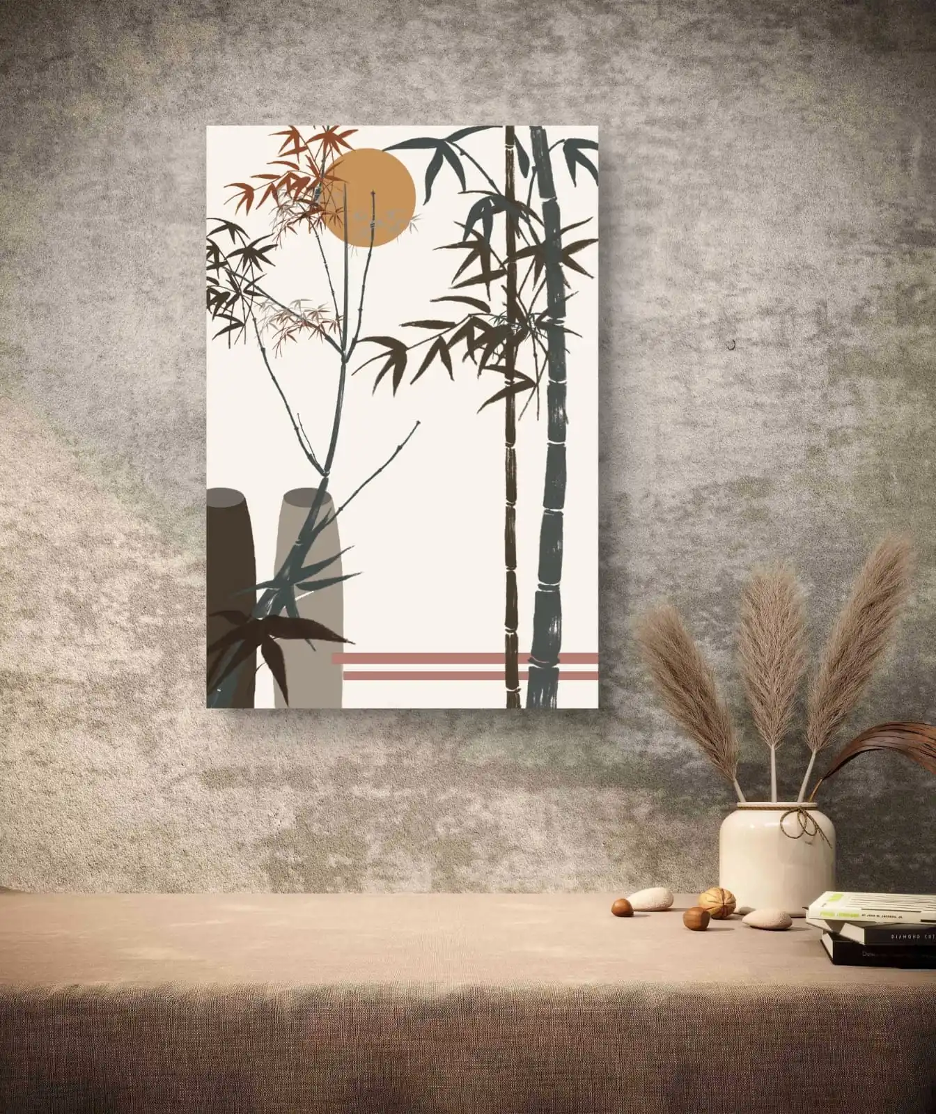Boho Bamboo Sunscape is an original handmade boho artwork inspired by calm nature scenes. The design shows soft bamboo branches and a warm sun in earthy tones.