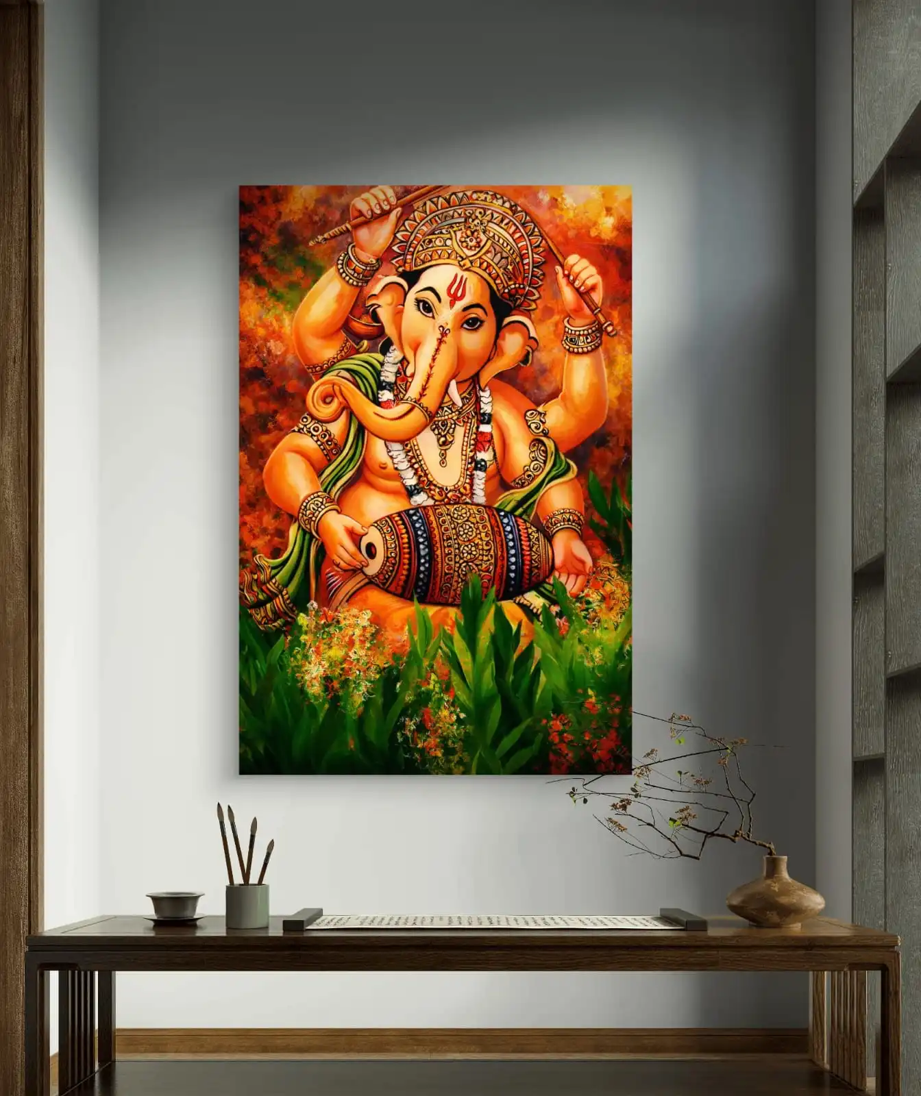 The artwork shows Lord Ganesha in a peaceful musical flow. The form feels calm and balanced. The texture adds depth and soft energy. It creates a sense of devotion and inner peace.