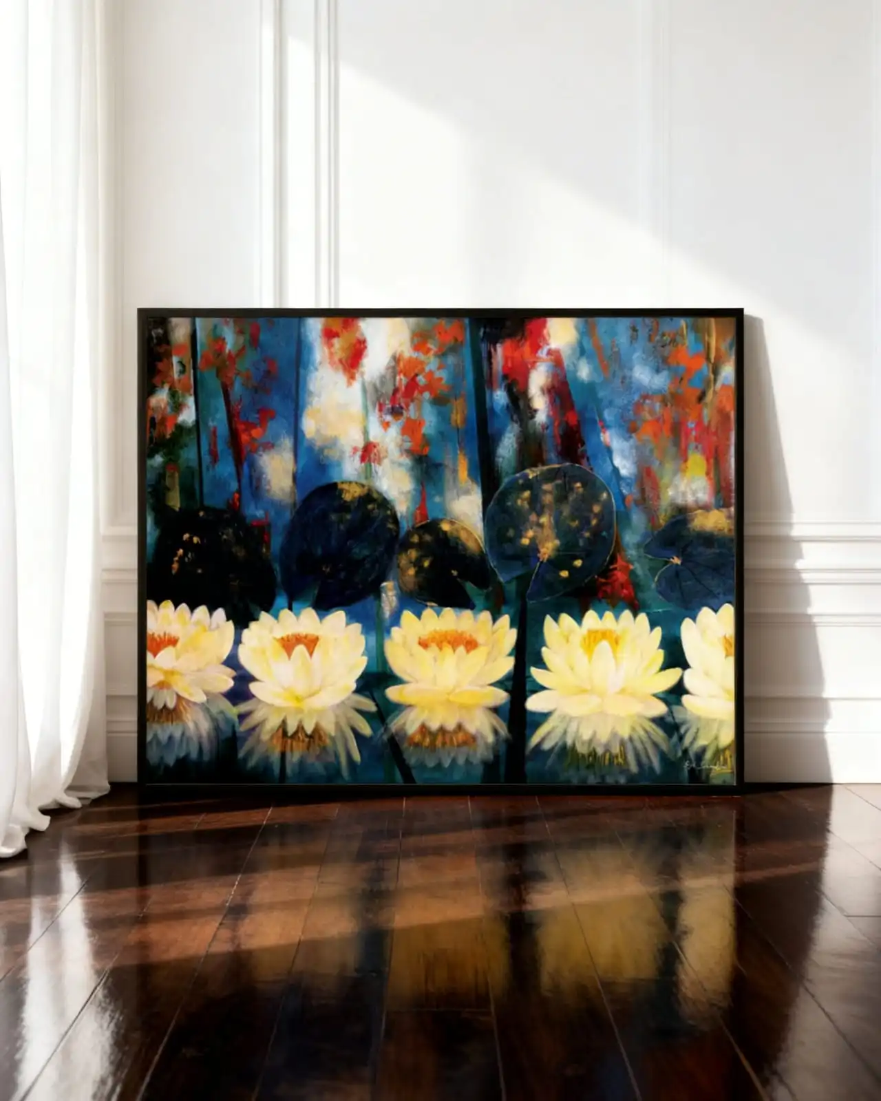 This Dancing Mood floral painting shows bright flowers in a lively design. The shapes and colors create a joyful and energetic feeling. The artwork brings freshness and beauty to any wall.