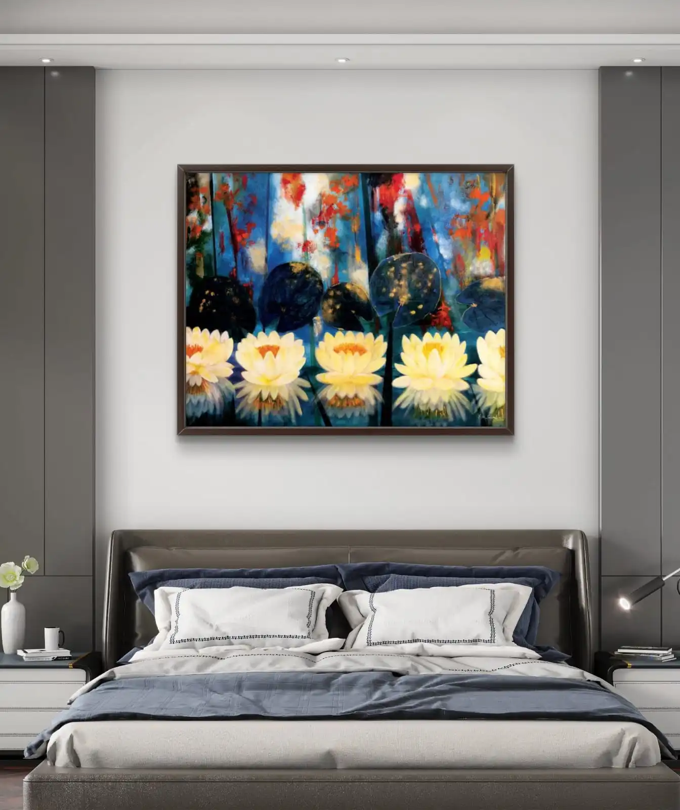 The painting is made with acrylic colors on canvas. Soft brush strokes and rich tones give the flowers depth and texture. The floral forms look vibrant and full of life.