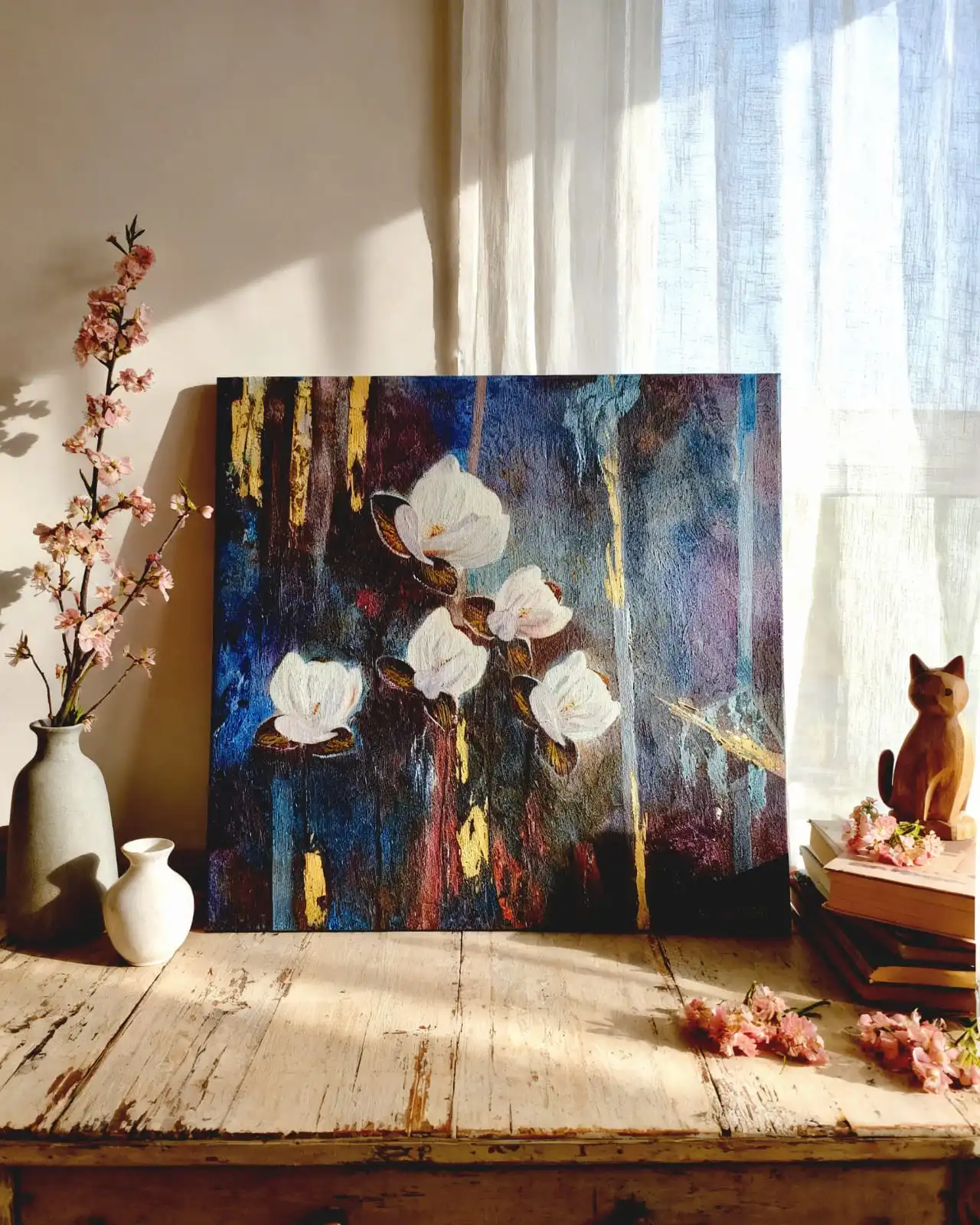 This Five Blessed Stars painting is an original acrylic artwork by artist Sabiha Hasan Sumbul. The size of the painting is 24 × 24 inches. The artwork comes with an authenticity certificate and purchase invoice. It is a meaningful piece for homes, offices, and art collectors who enjoy thoughtful floral paintings.
