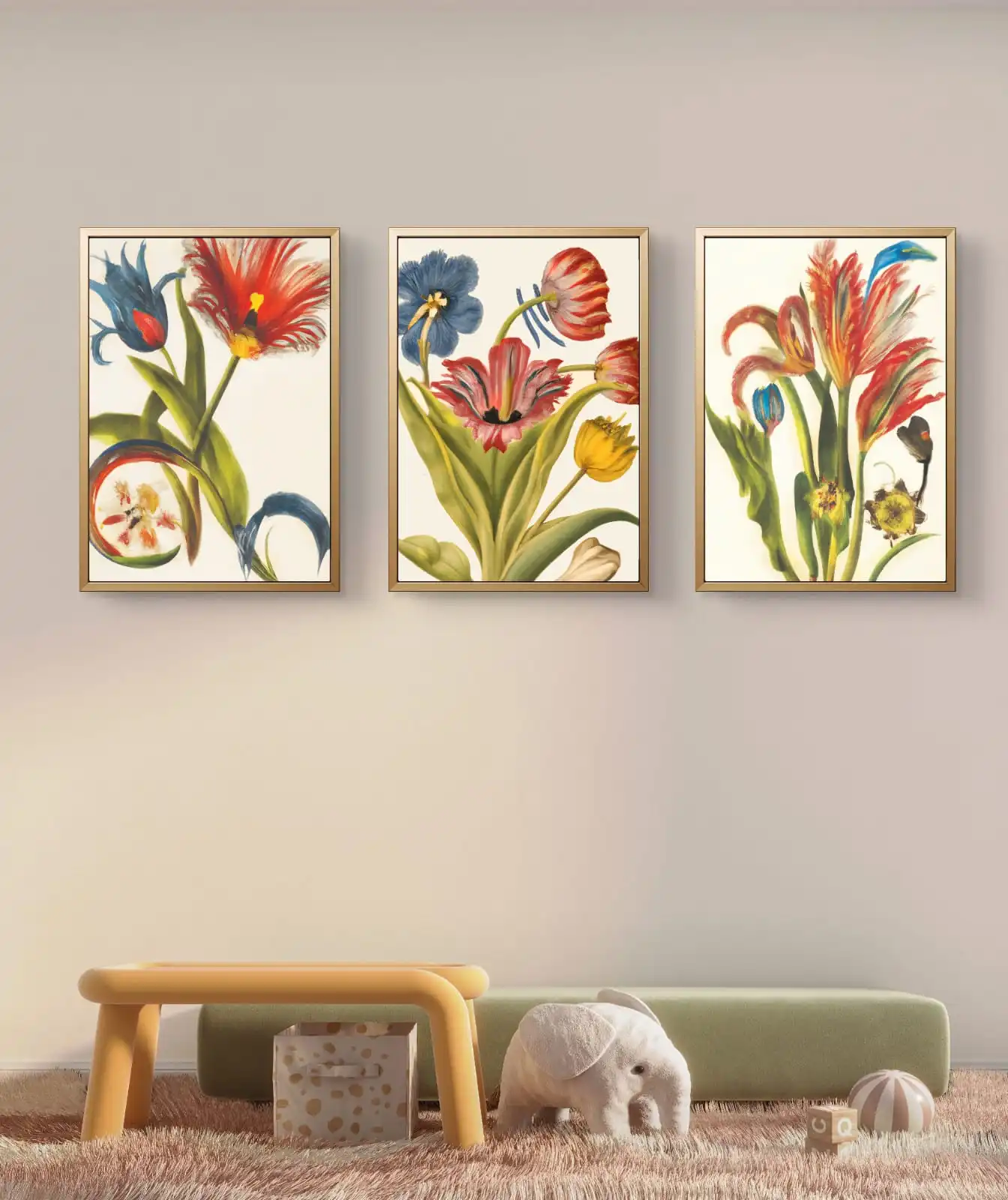Flowers are symbols of beauty, joy, and renewal. In this set, bright colors and soft brushstrokes create a fresh and cheerful feel. Also, the balanced floral layouts make your space calm and inviting. Hang all three together for a gallery look, or place them separately in different rooms. Additionally, the small details make each painting fun to explore up close.