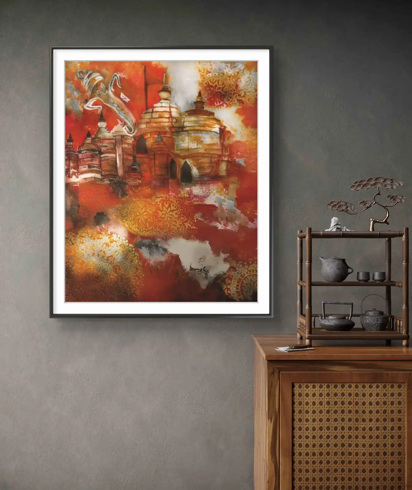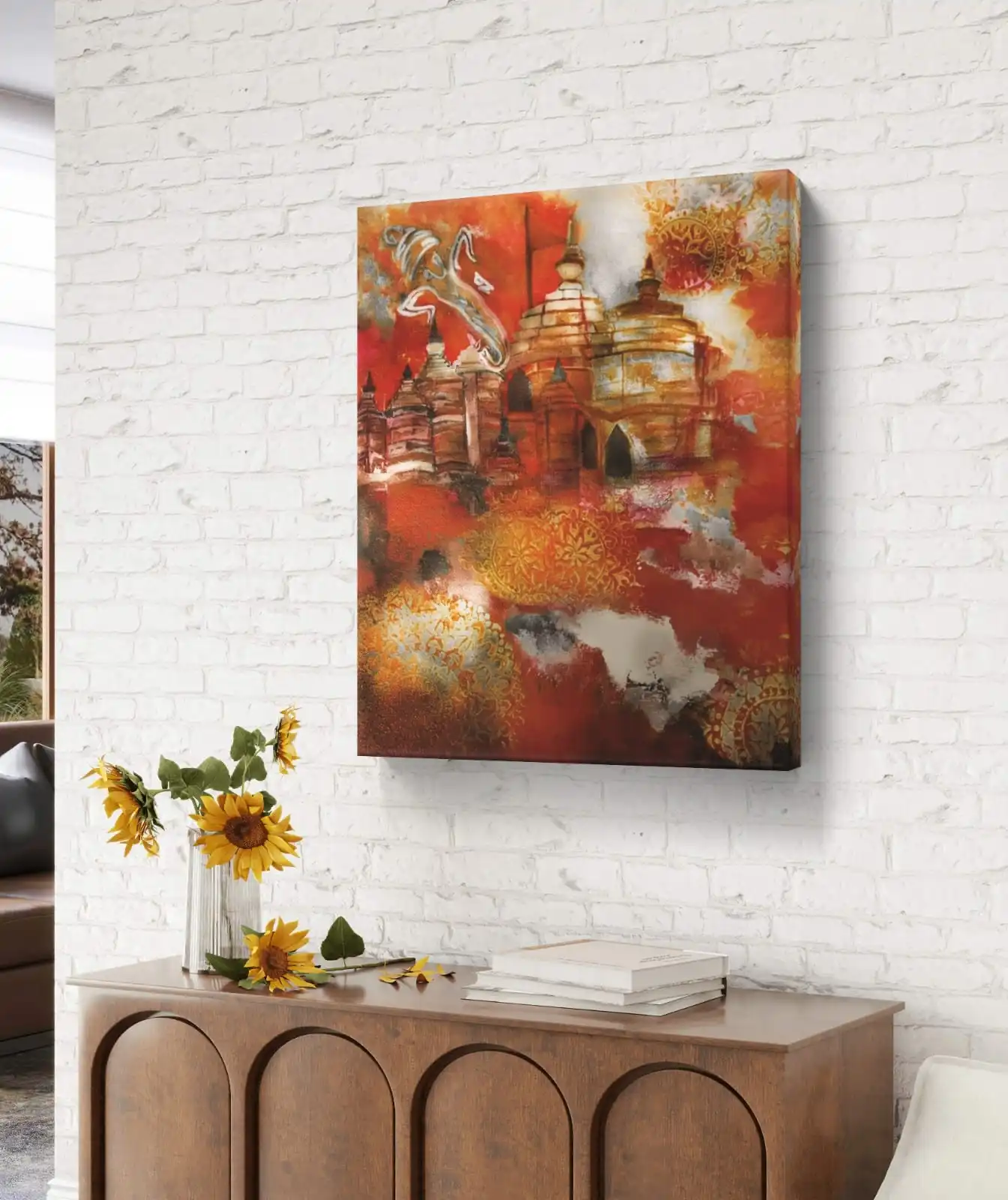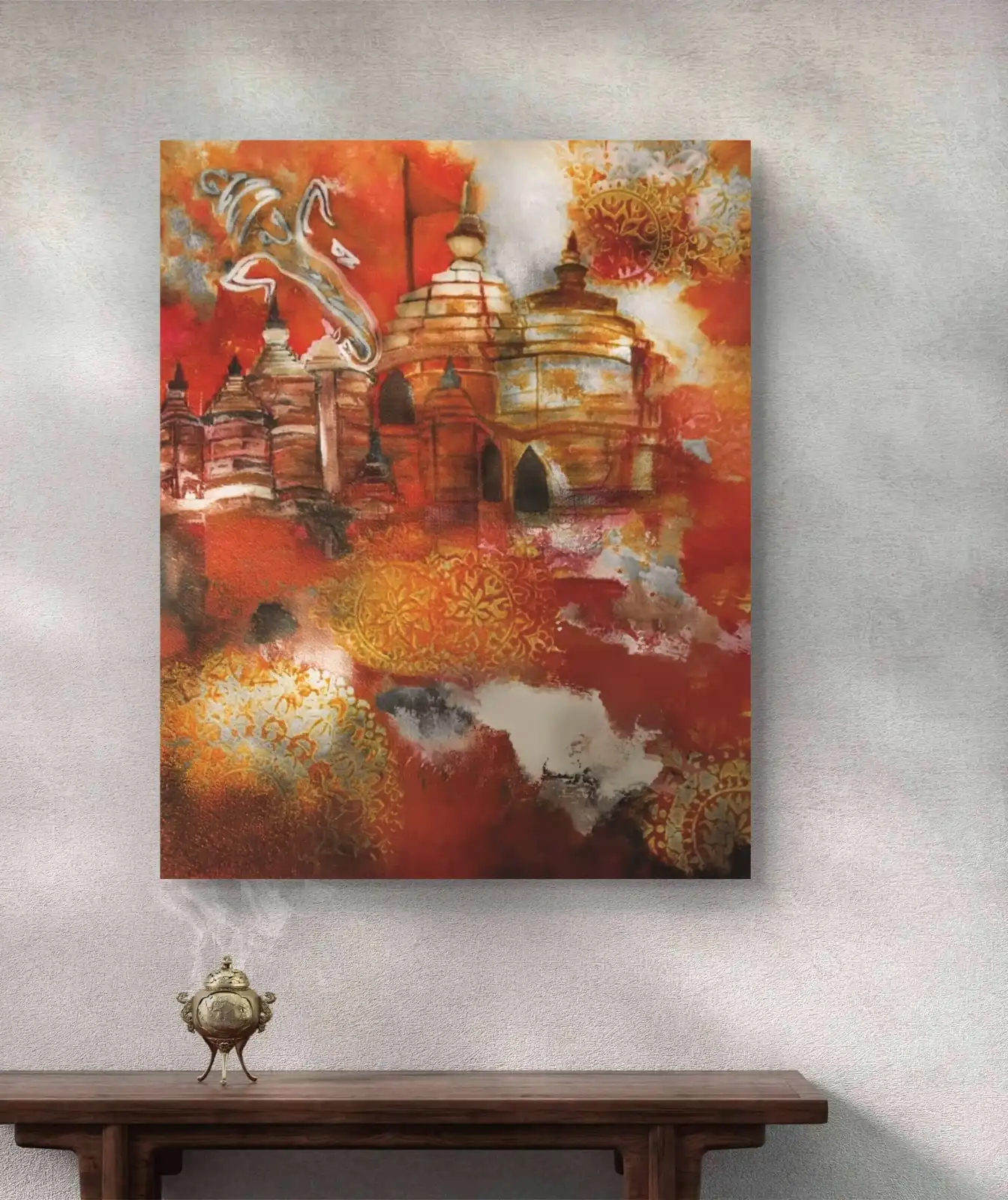 The Ganesha Temple Echoes Canvas is a detailed acrylic art print made for modern décor. It has warm tones, clear lines, and a calm look that adds peace to any room. The artwork is printed on premium cotton canvas, so the colors stay rich for years. Each stroke in this print brings depth and balance, making it a strong décor piece for living rooms, offices, and studios.