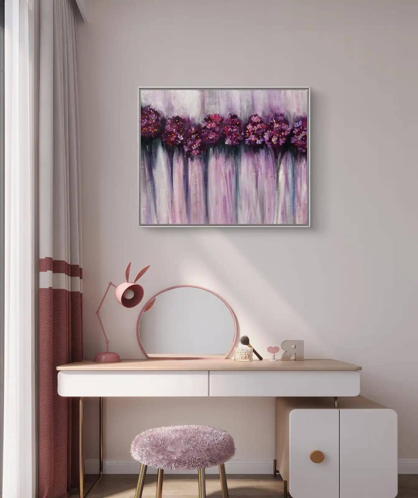 Geranium Floral Embrace Painting is an acrylic floral artwork showing blooming geranium flowers gathered like a warm welcome. Soft purple tones and gentle textures create a calm and elegant mood. The painting measures 21 × 25 inches, is professionally framed, and comes ready to hang.