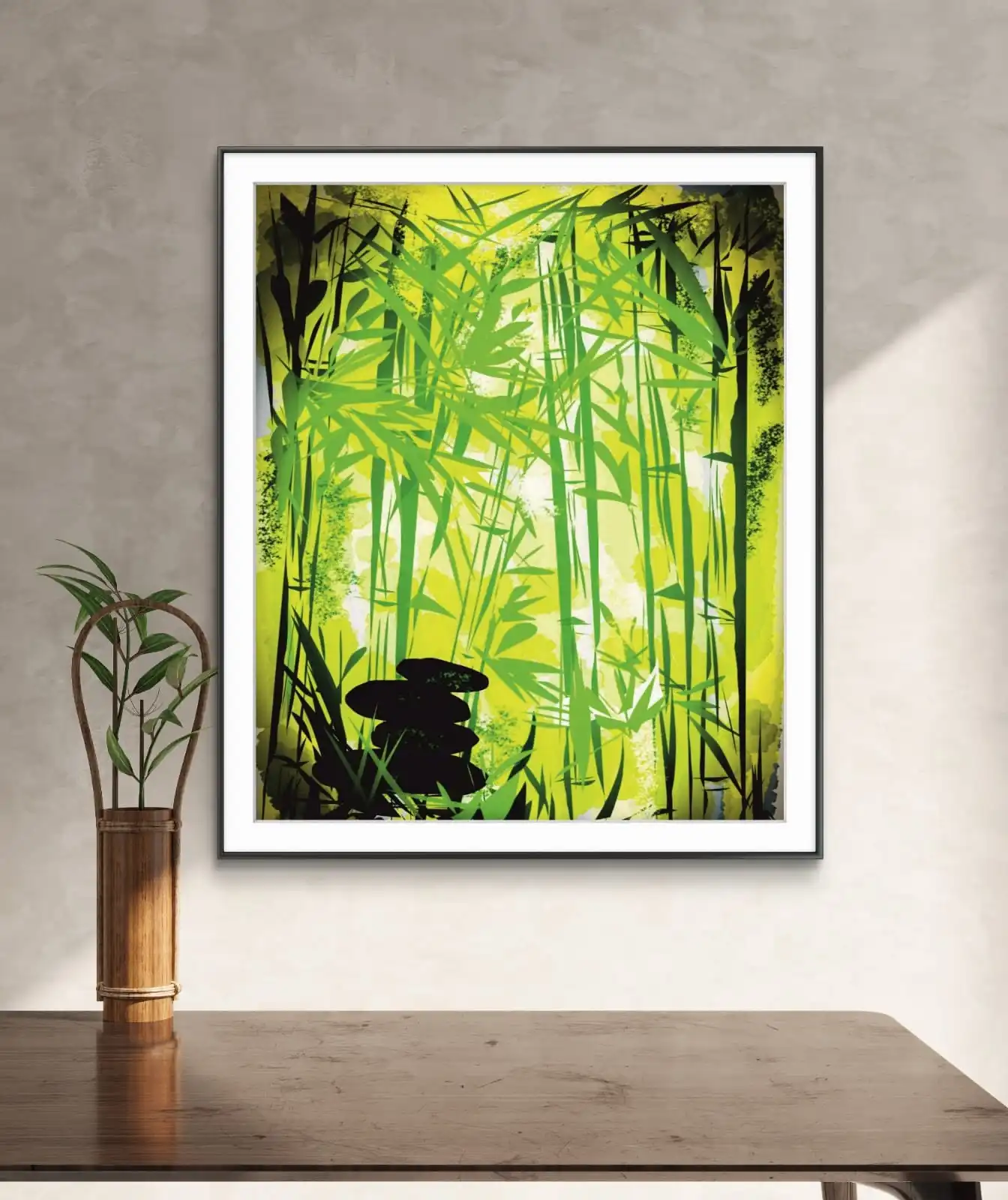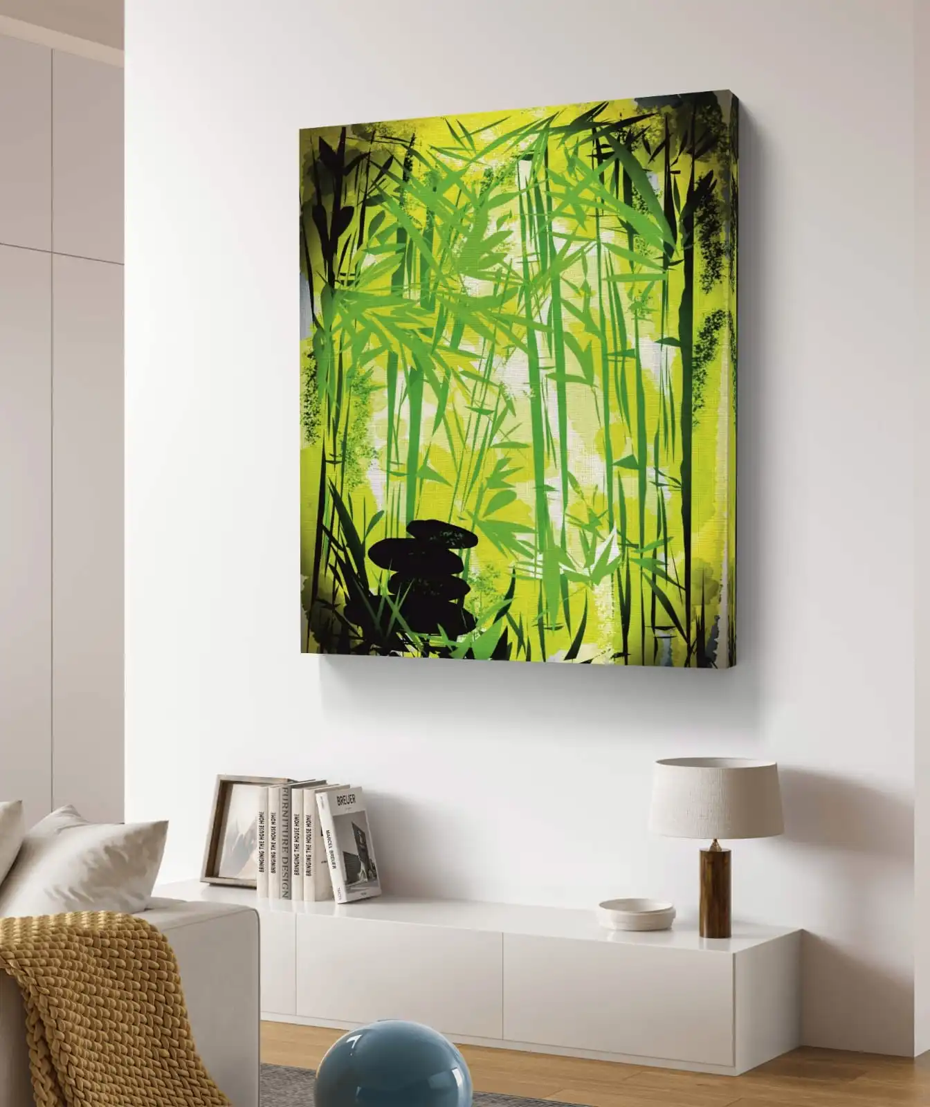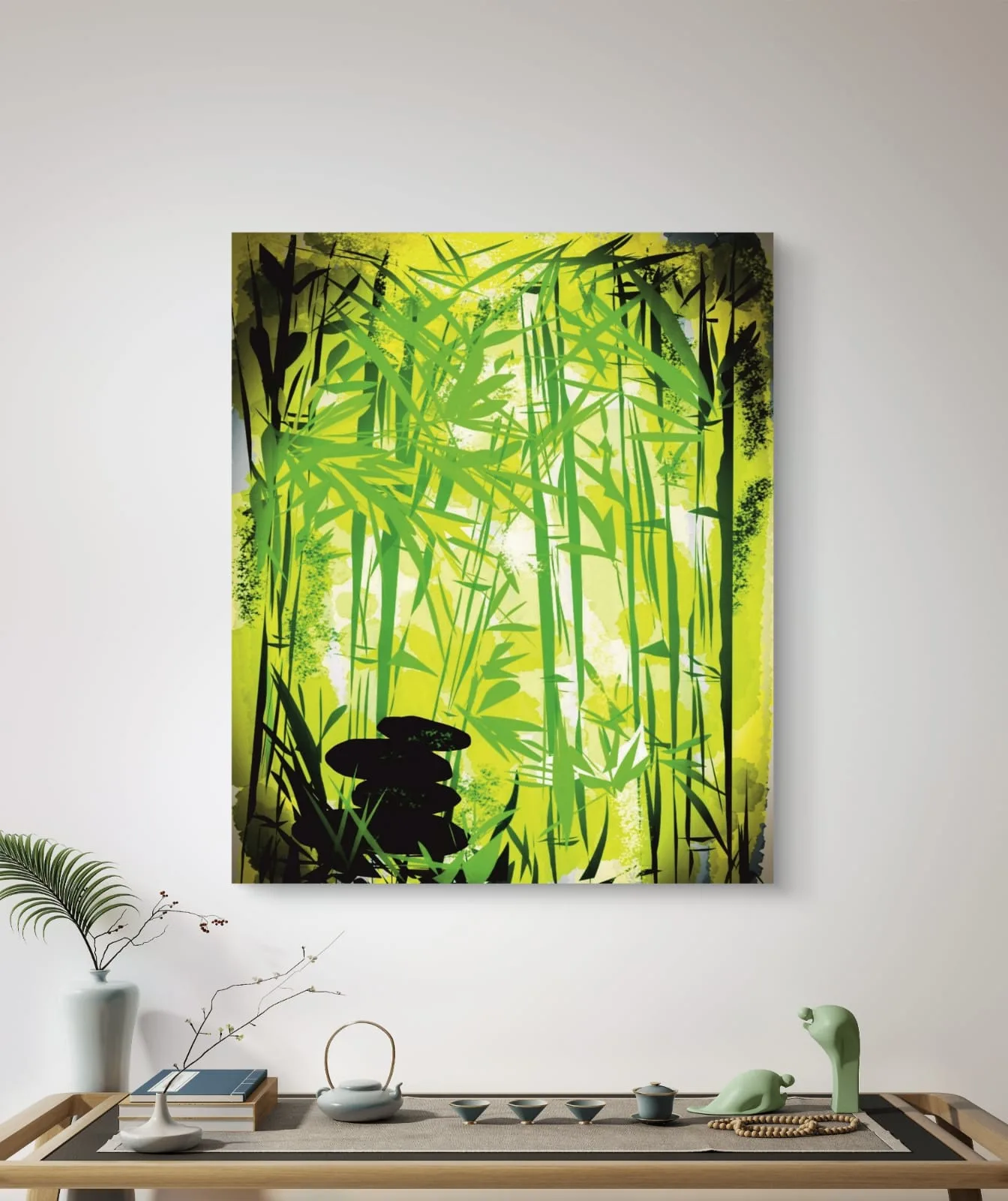 Golden Bamboo Fortune Painting is a calming wall piece that celebrates growth and good fortune. This fine art print is made on cotton canvas, giving it a smooth and lasting finish. The design captures the strength and beauty of bamboo, a symbol of wealth and harmony in Feng Shui.