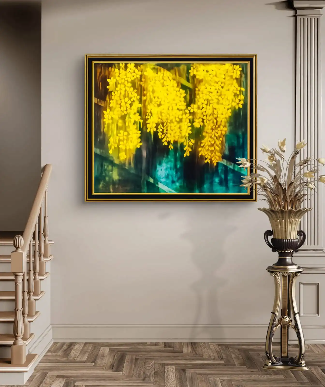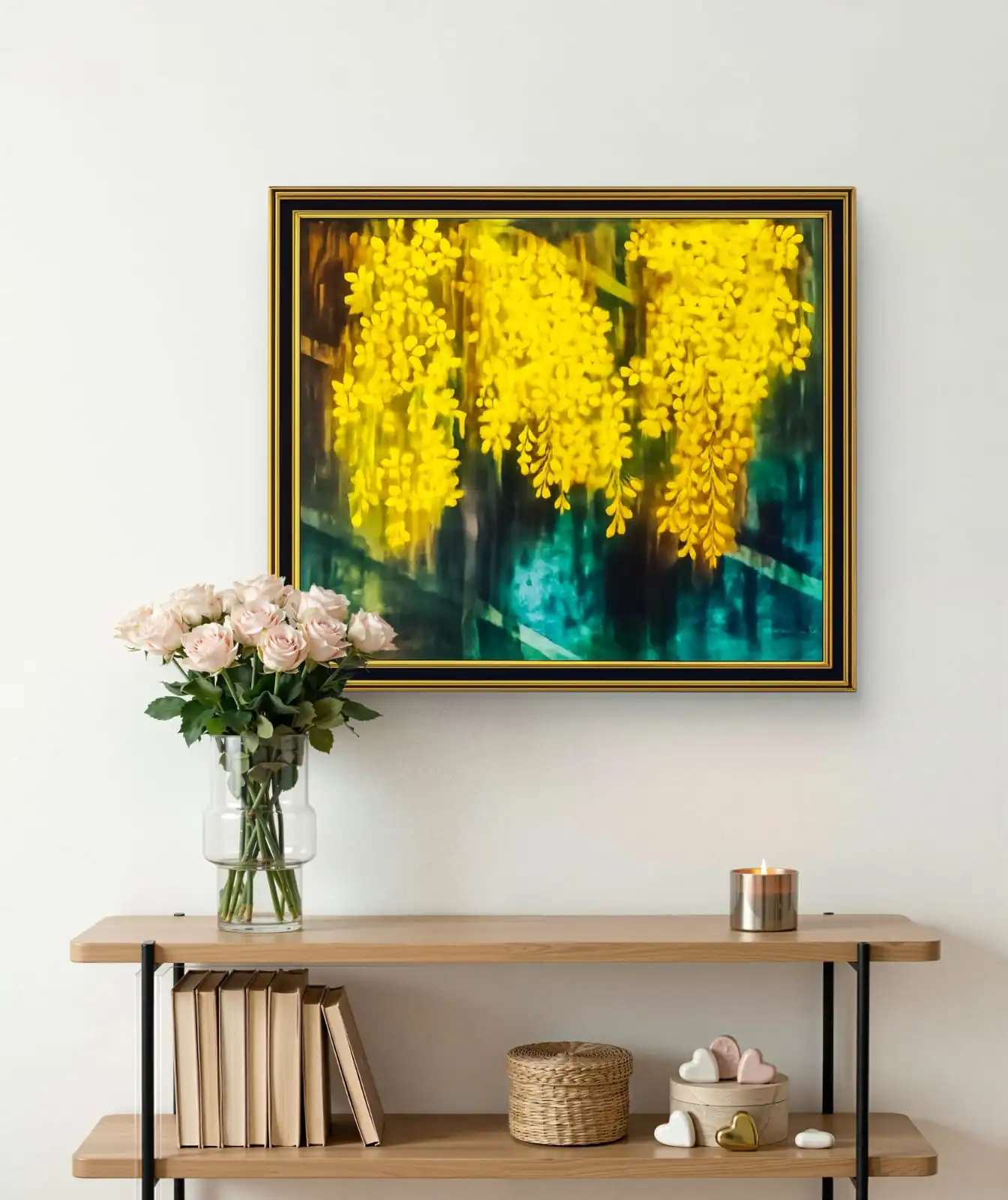Golden Cassia Flower Painting looks beautiful in living rooms, studios, and office walls. The artwork size is 32 × 28 inches, which makes it easy to notice in any room.