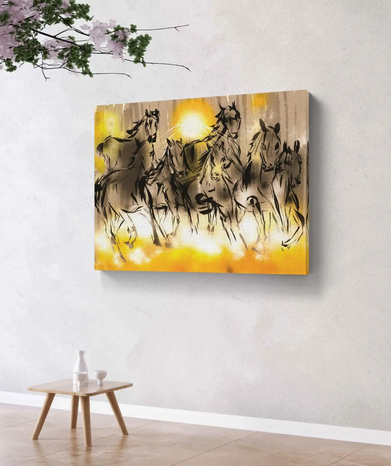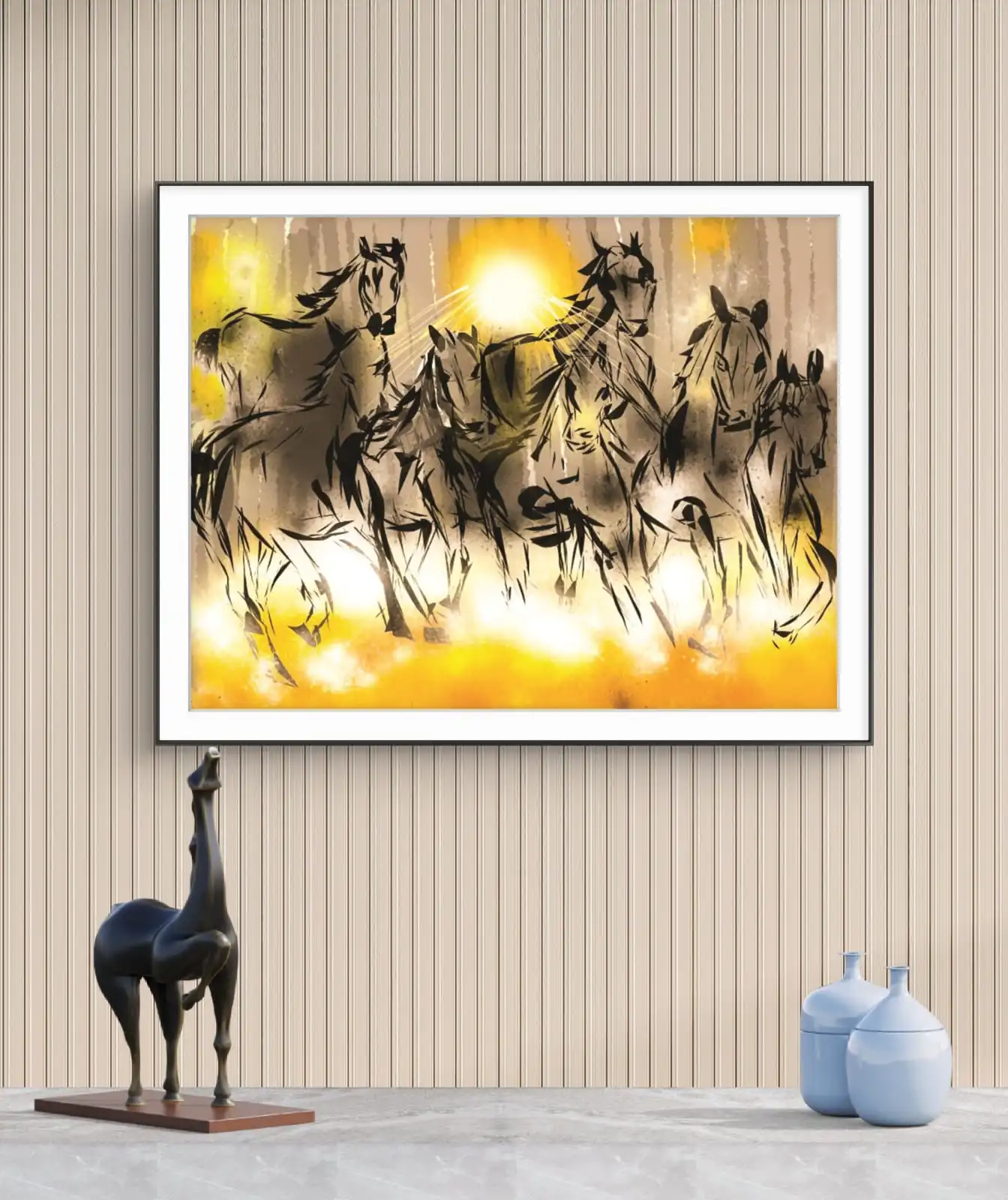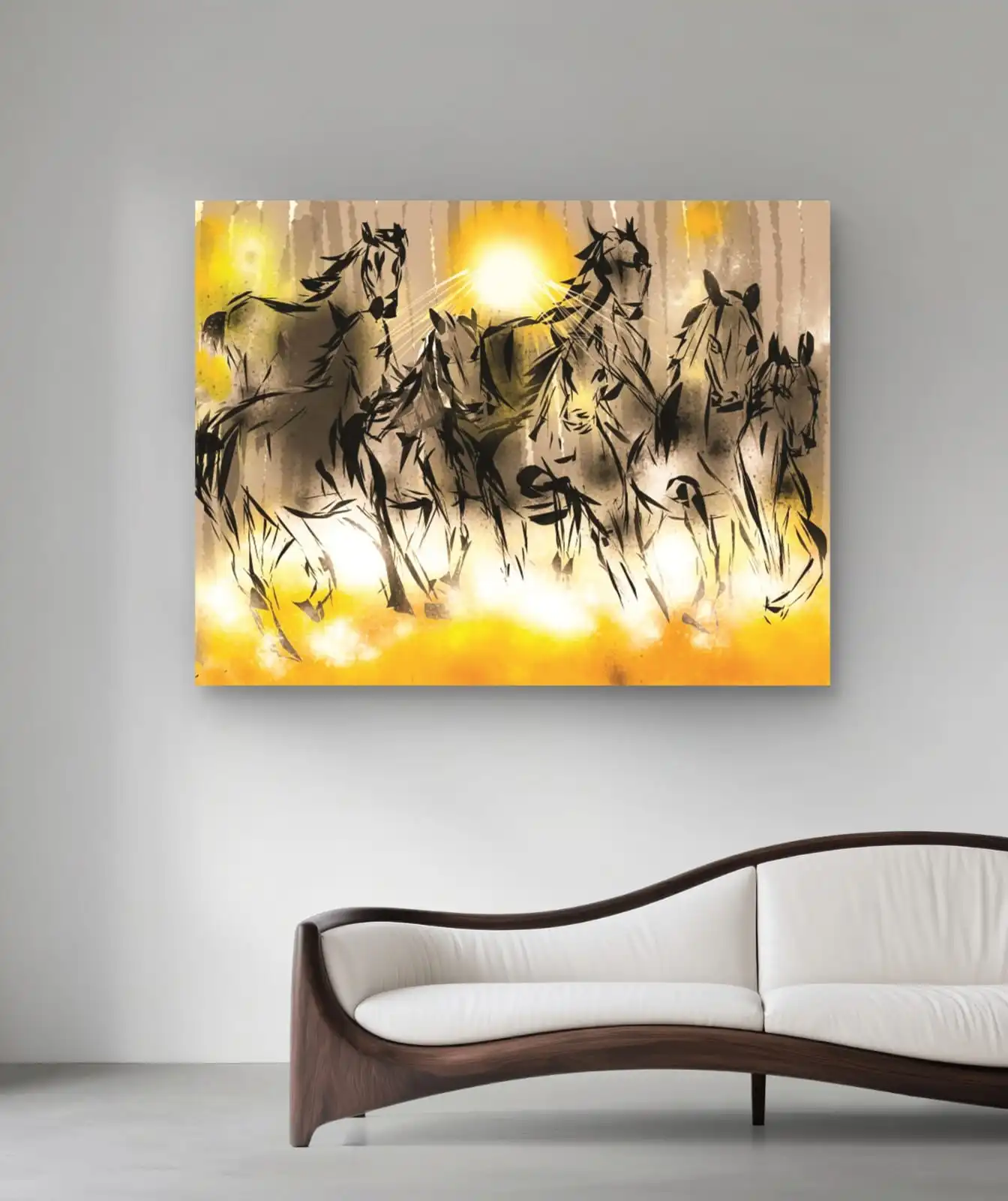Bring warmth and energy to your walls with the Golden Gallop Artwork Print. This abstract painting shows Seven Running Horses in yellow and brown tones. They symbolize speed, success, and good fortune in Vaastu and Feng Shui.