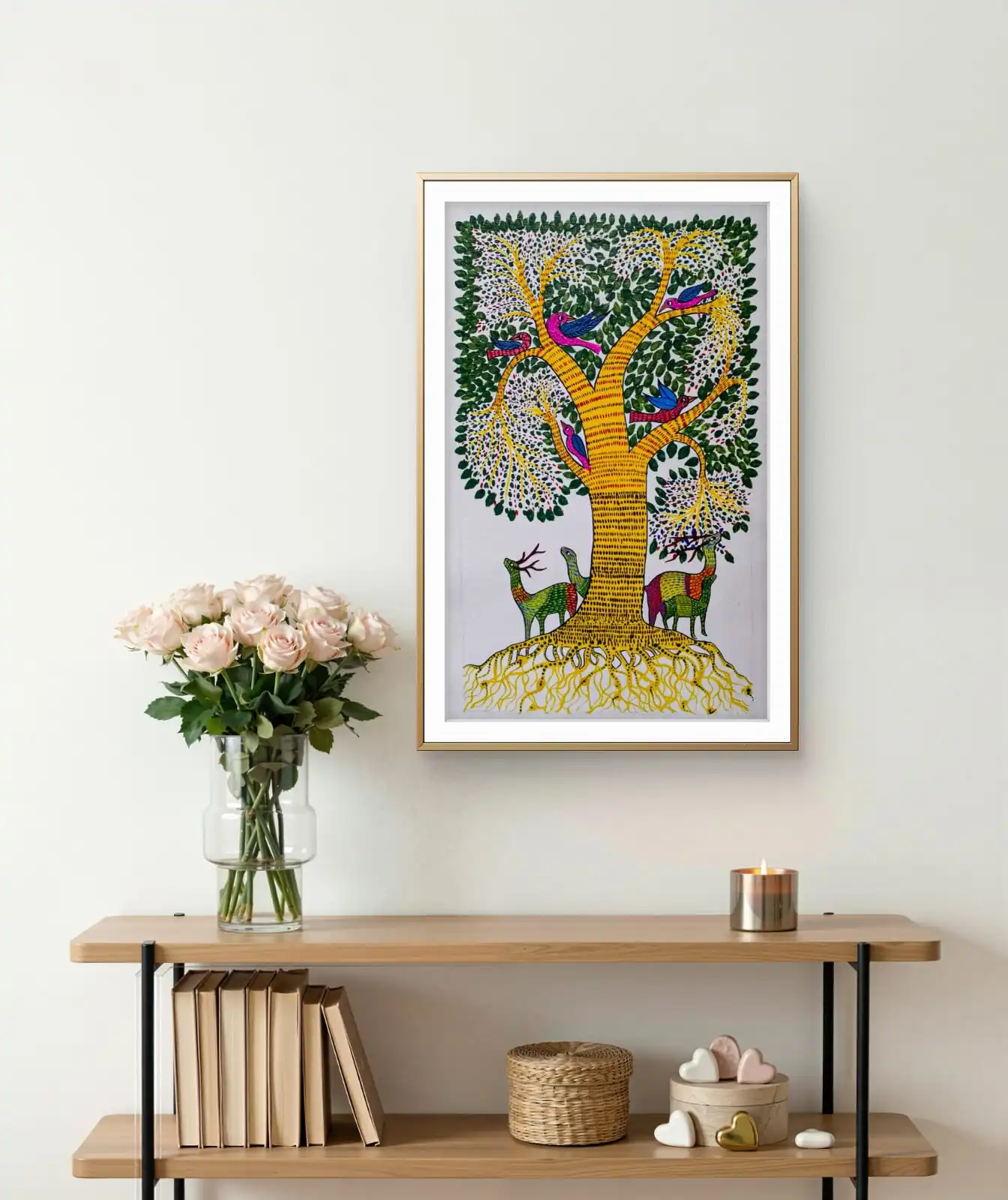 The artwork follows the traditional Gond folk art style. Small dots, lines, and patterns fill the tree, birds, and deer. These details give the painting a lively and decorative look. The warm colors make the artwork bright and eye-catching.