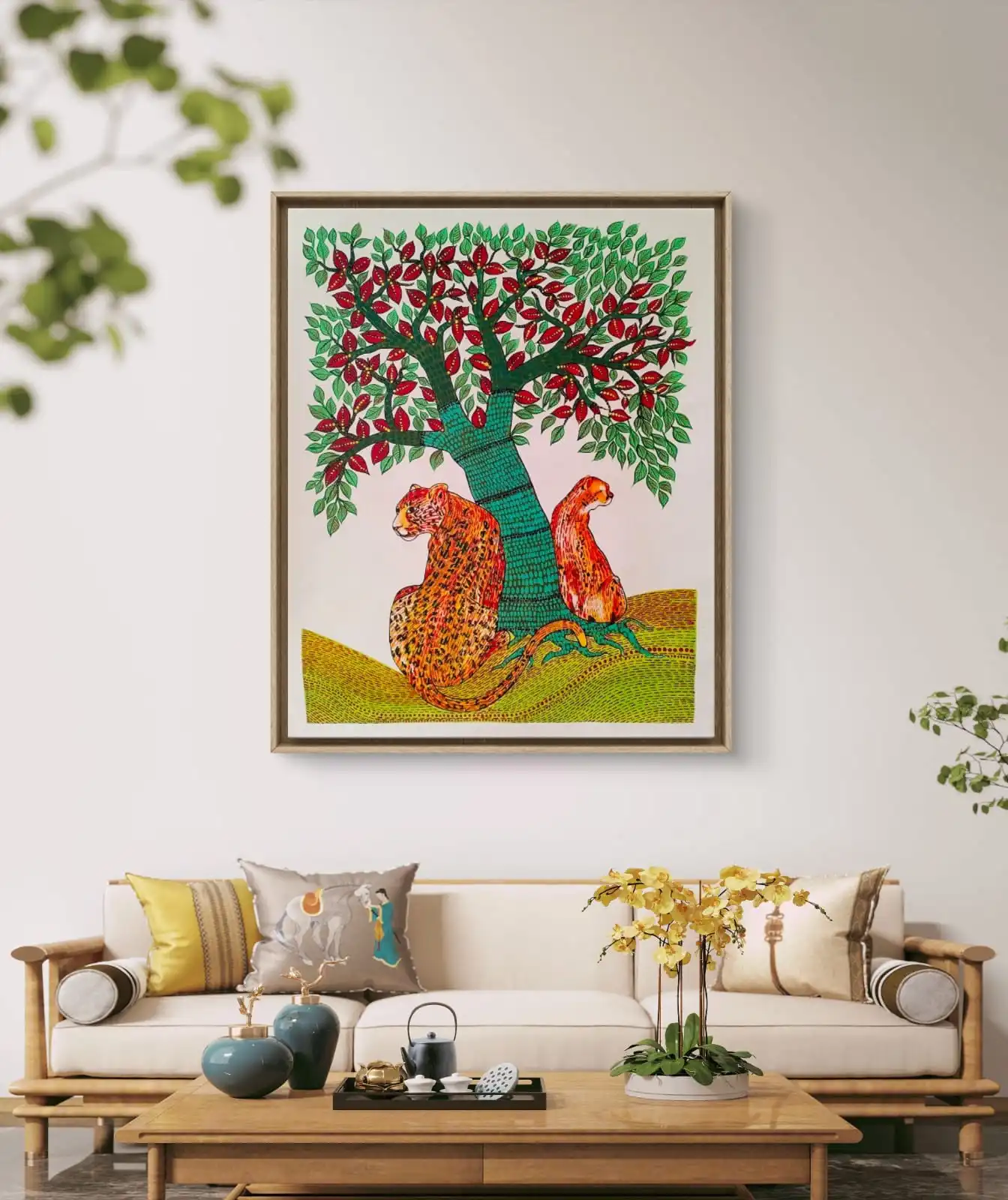A vibrant Gond Leopard Harmony Painting showing two leopards resting beneath a leafy tree. The artwork reflects balance and harmony in nature through colorful tribal patterns and traditional Gond art details.