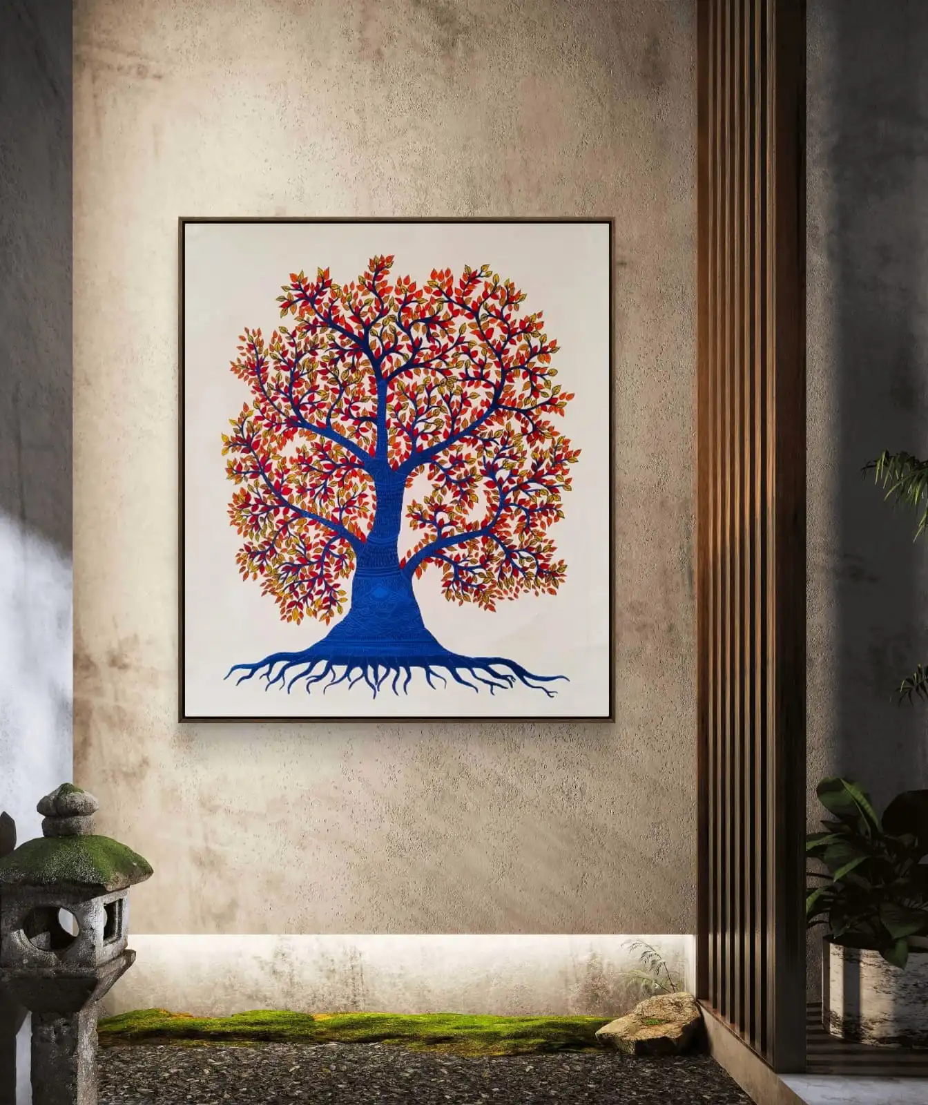 A vibrant Gond Tree of Life painting inspired by traditional Indian tribal art. The artwork features a detailed tree filled with colorful leaves and intricate patterns. These elements symbolize growth, balance, and the deep connection between nature and life.
