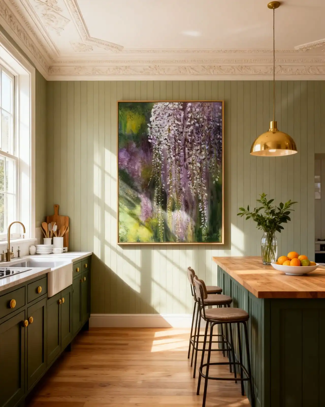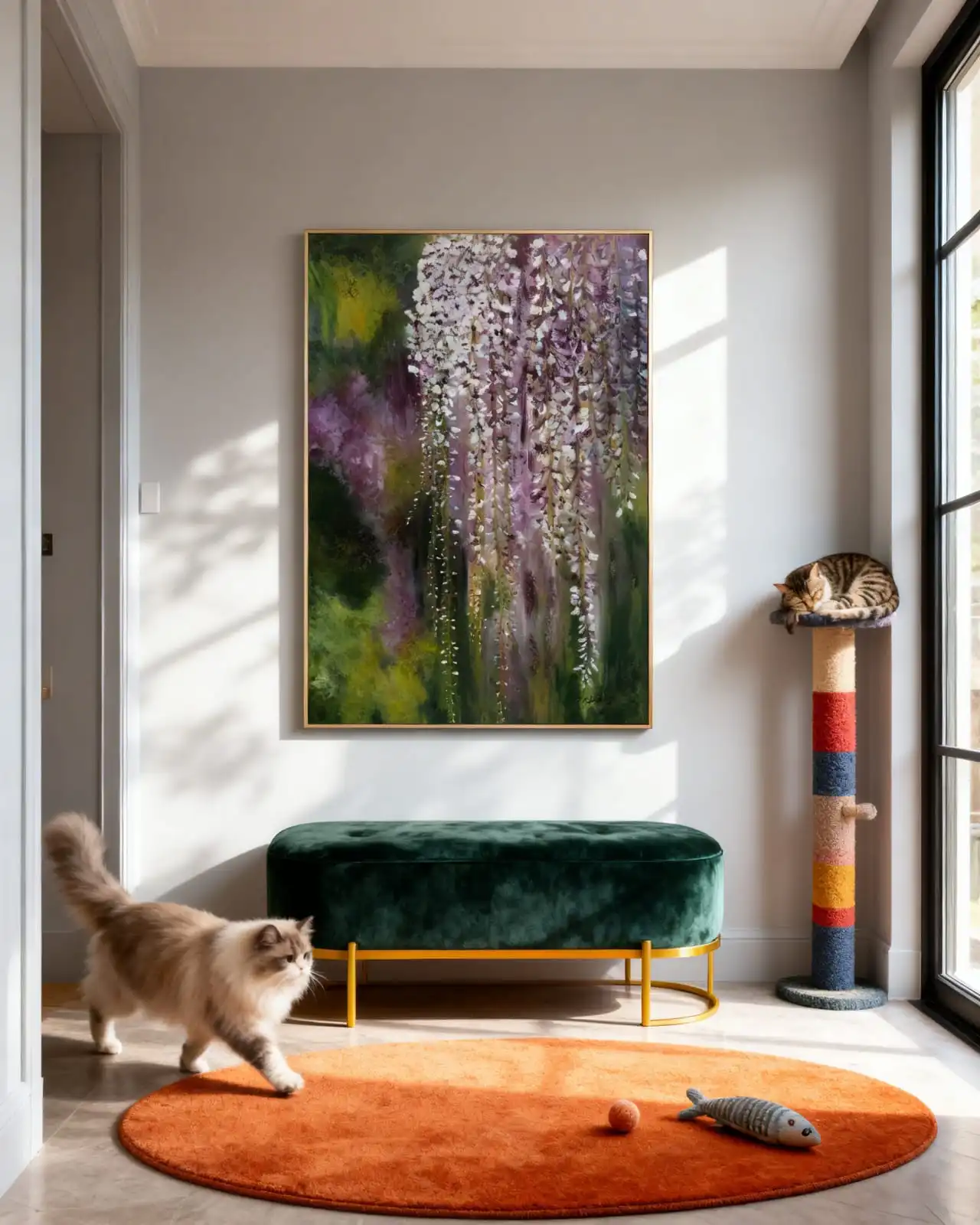 Hanging Wisteria Acrylic Painting shows delicate purple wisteria flowers flowing gently like a blooming vine. Soft colors bring a peaceful garden feeling to the space.