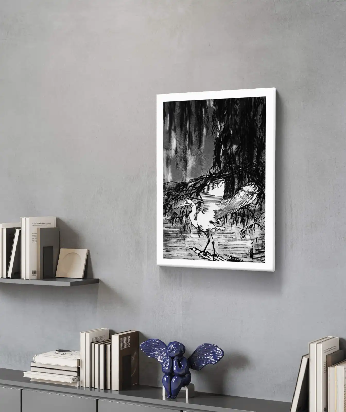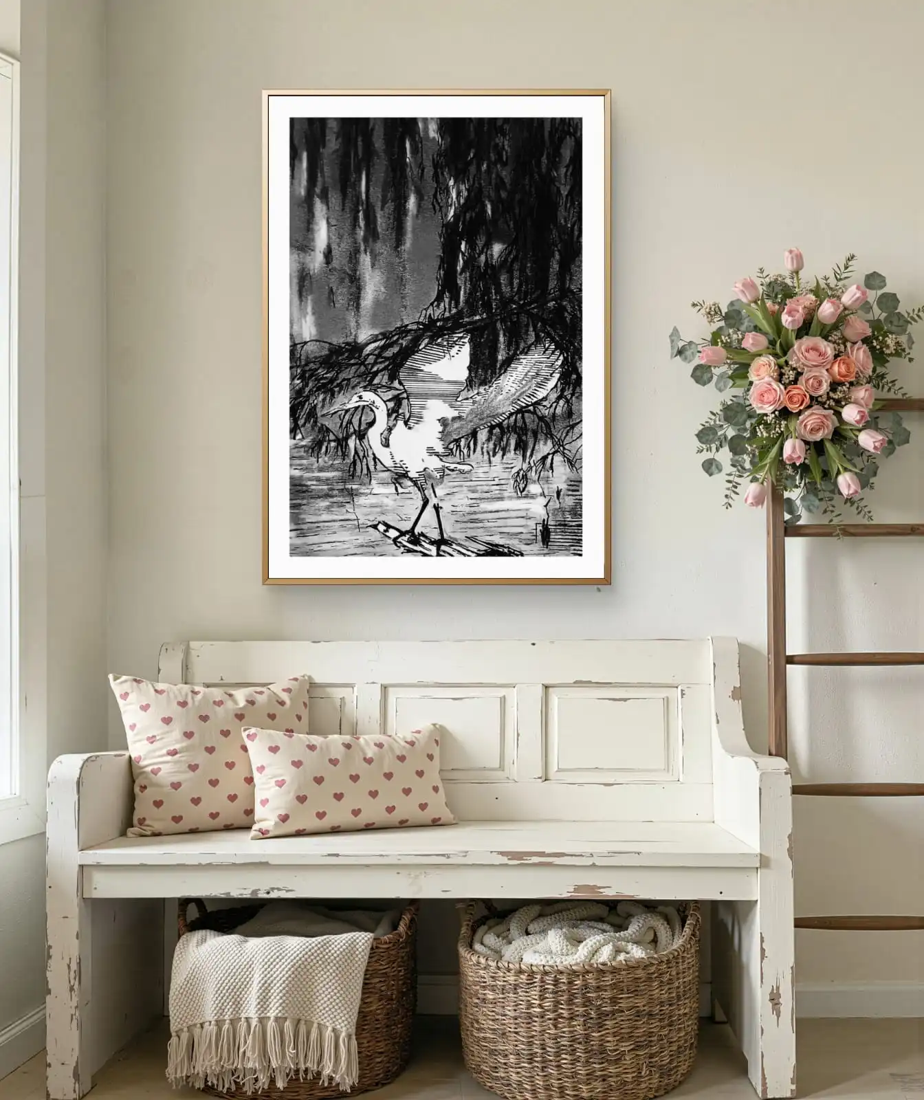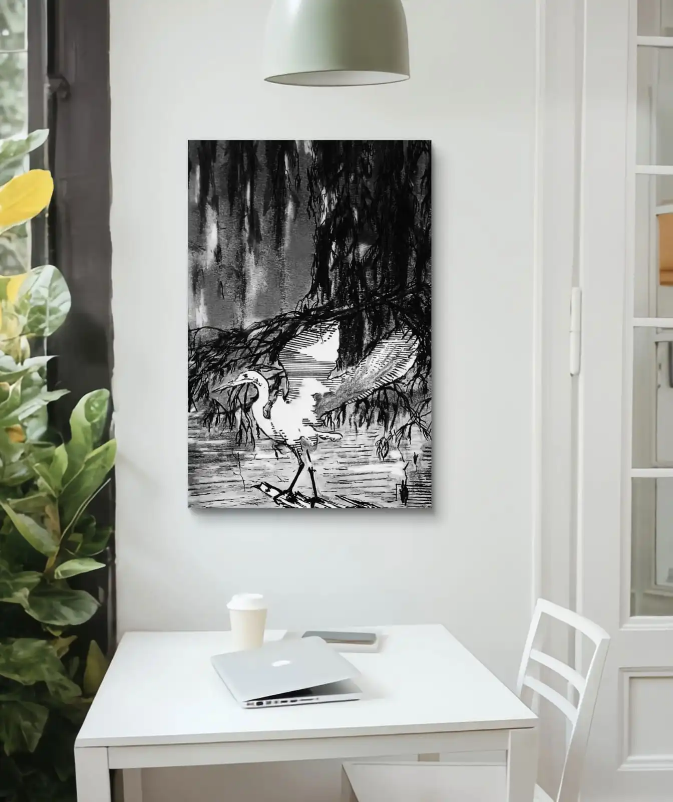 This Heron Under Willow Sketch captures calm, patience, and natural beauty. The simple monochrome style makes the scene feel peaceful. It suits modern, rustic, and classic interiors.