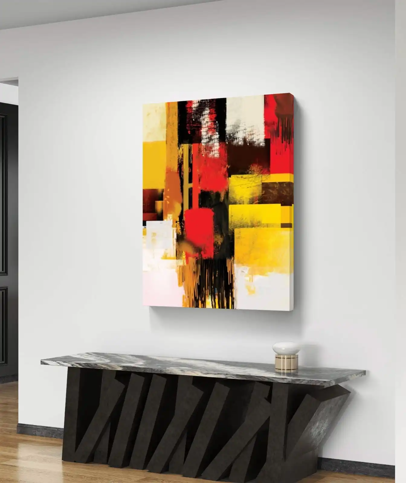 Each Melting Blocks Abstract Painting is signed by the artist and available in classical frame, gallery wrap, or unframed options. Its bright colors and modern design make it perfect for any room or office wall.