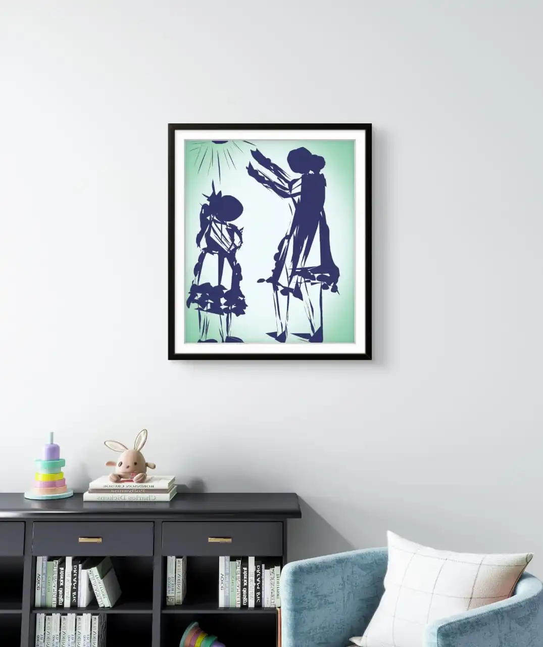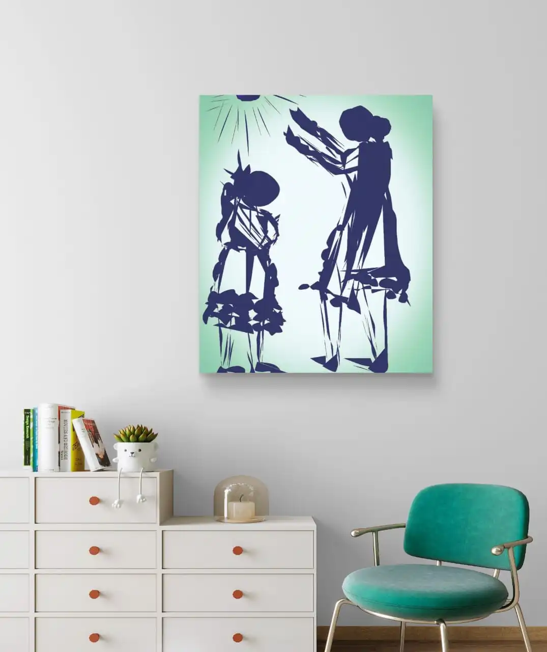 Blessing is a handmade original digital canvas artwork that captures the purity of a mother’s unconditional love. Soft blue brush strokes on a white and light green background reflect protection, emotion, and spiritual bonding.
