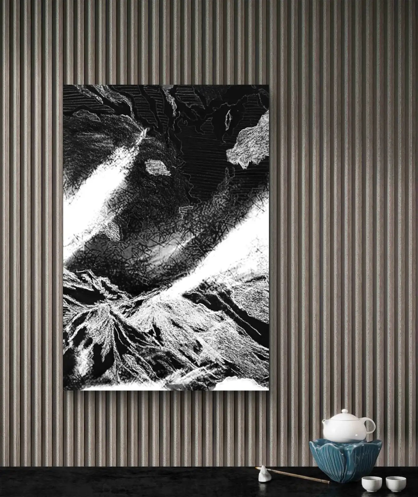 This Nightscape in White Artwork brings a calm and mysterious mood to any space. The black and white palette keeps the composition simple and elegant. It suits modern, minimal, and classic interiors.