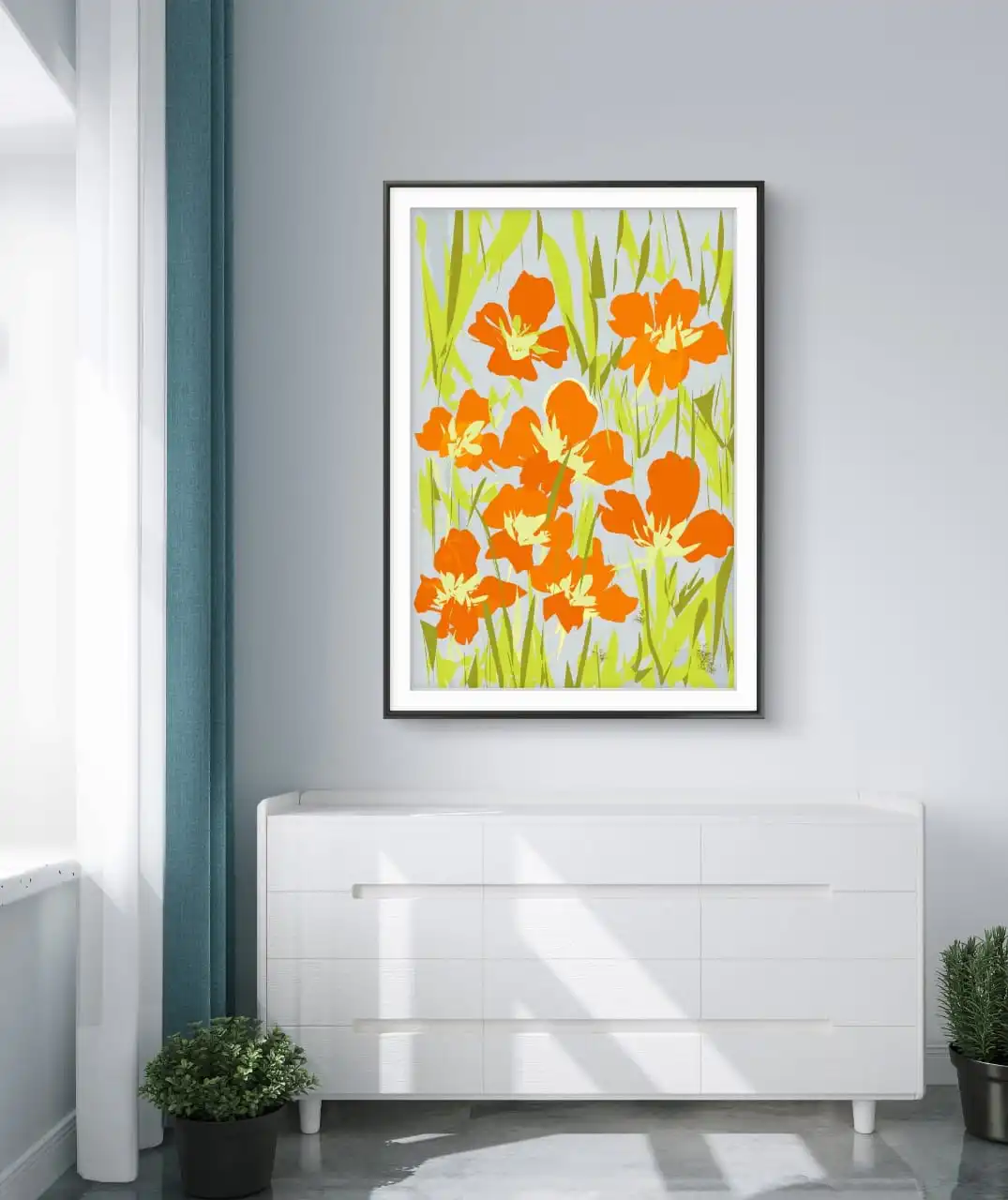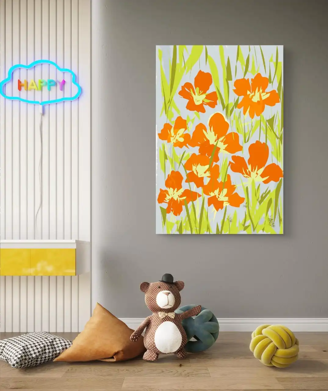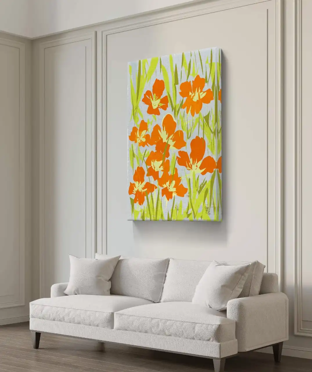 This floral wall art is versatile. It looks stunning in living rooms, bedrooms, offices, or creative spaces. The warm orange tones add energy, while the soft gray background keeps the design calm and elegant. This mix makes the artwork both bold and soothing.