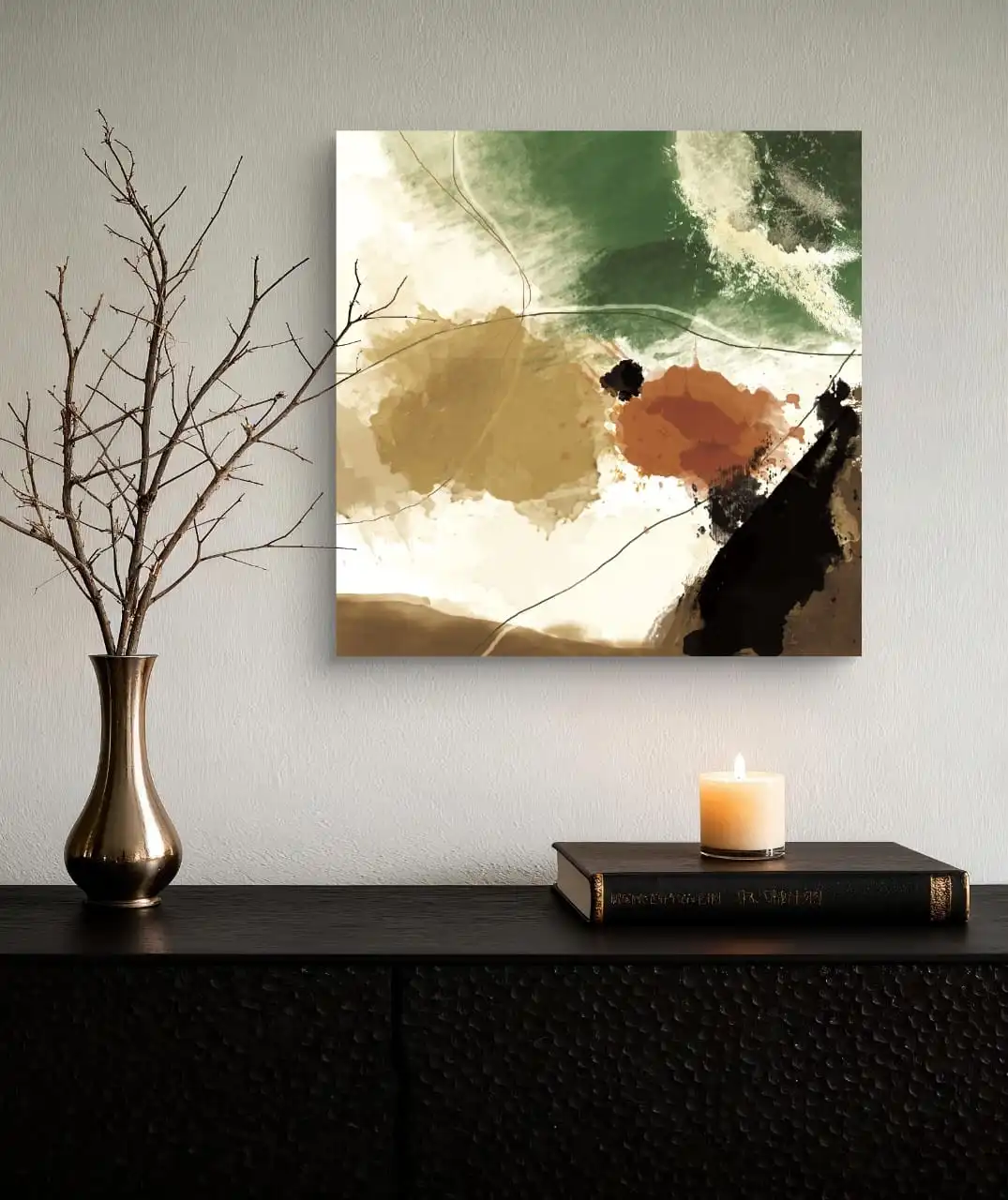 The Organic Balance Abstract Painting reflects the calm beauty of nature in a modern way. Soft green and brown layers mix with warm earthy tones, creating a gentle and timeless rhythm. Each brushstroke adds movement, balance, and quiet strength. This artwork brings warmth and depth to any space.