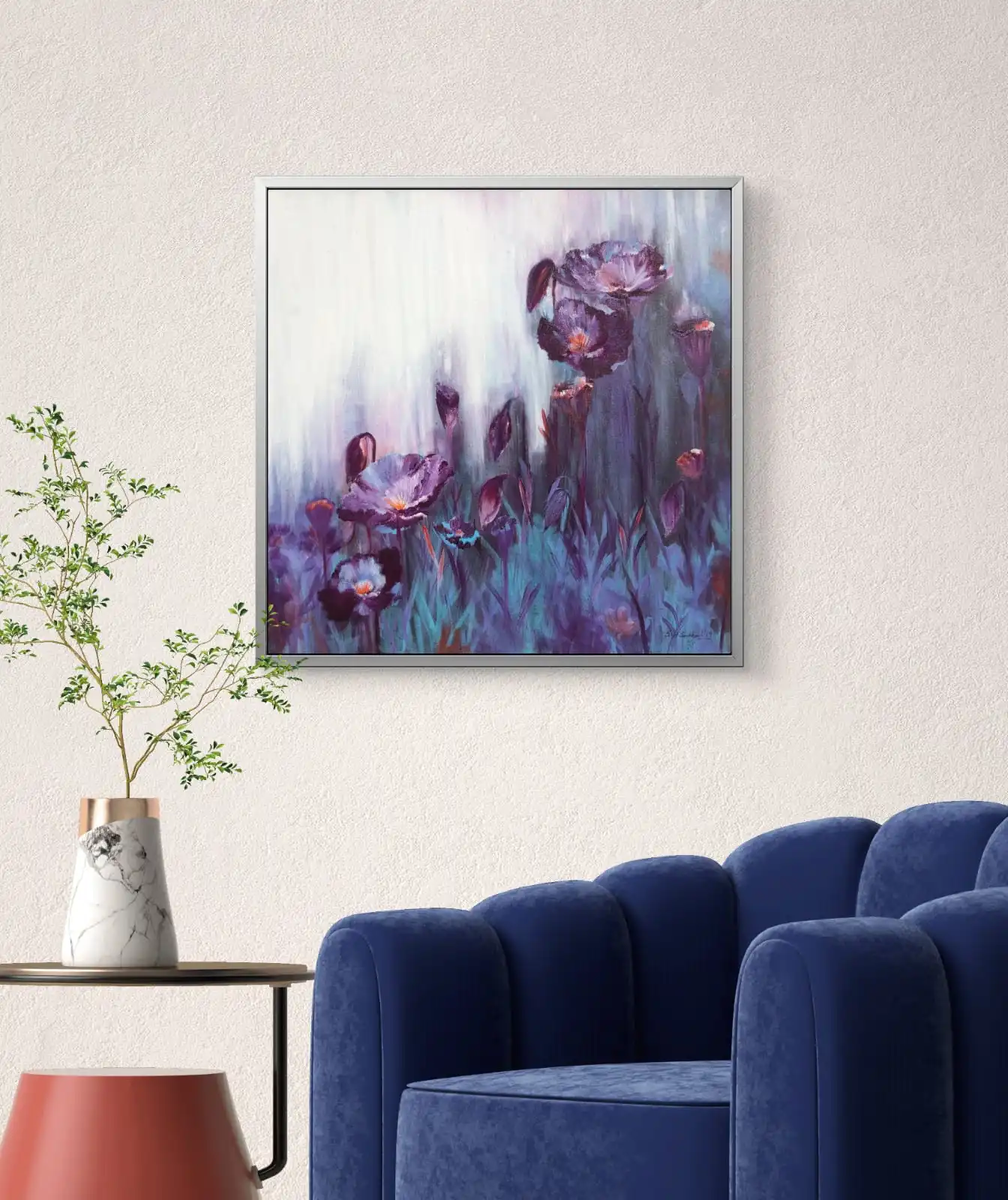 Purple Poppy Garden Artwork brings a fresh garden mood to living rooms, bedrooms, and studio spaces. The artwork size is 26 × 26 inches. It is acrylic on canvas, framed and ready to hang.