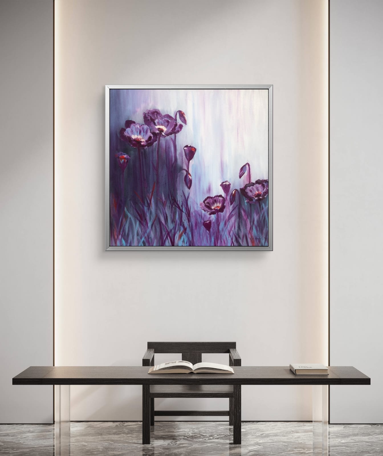 Purple Poppy Garden Painting brings a fresh garden mood to living rooms, bedrooms, and studio spaces. The artwork size is 26 × 26 inches. It is acrylic on canvas, framed and ready to hang.