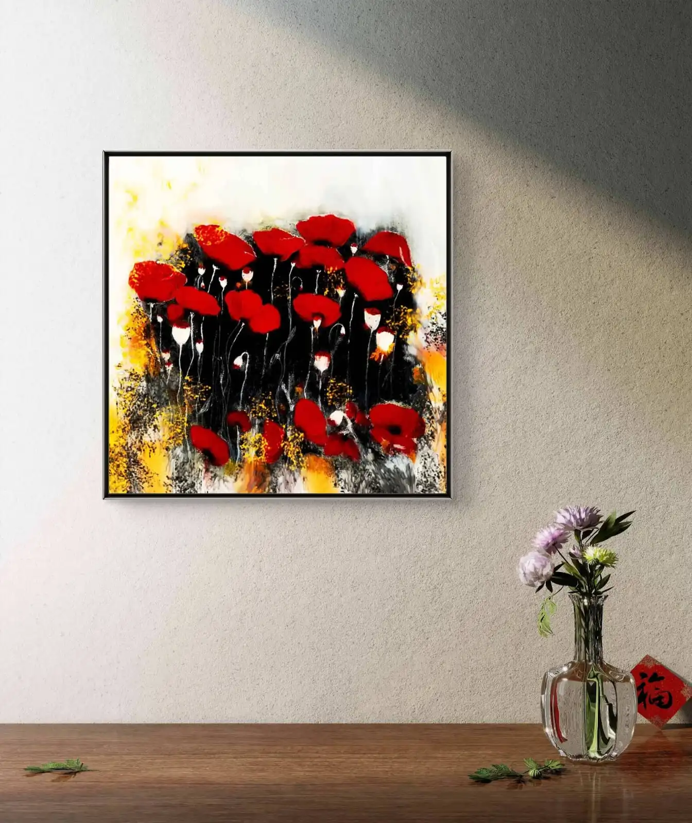 This Red Poppies in Bloom painting is a handmade acrylic artwork on canvas. Smooth brushstrokes add texture and depth. The painting reflects beauty, strength, and calm emotion through blooming flowers.