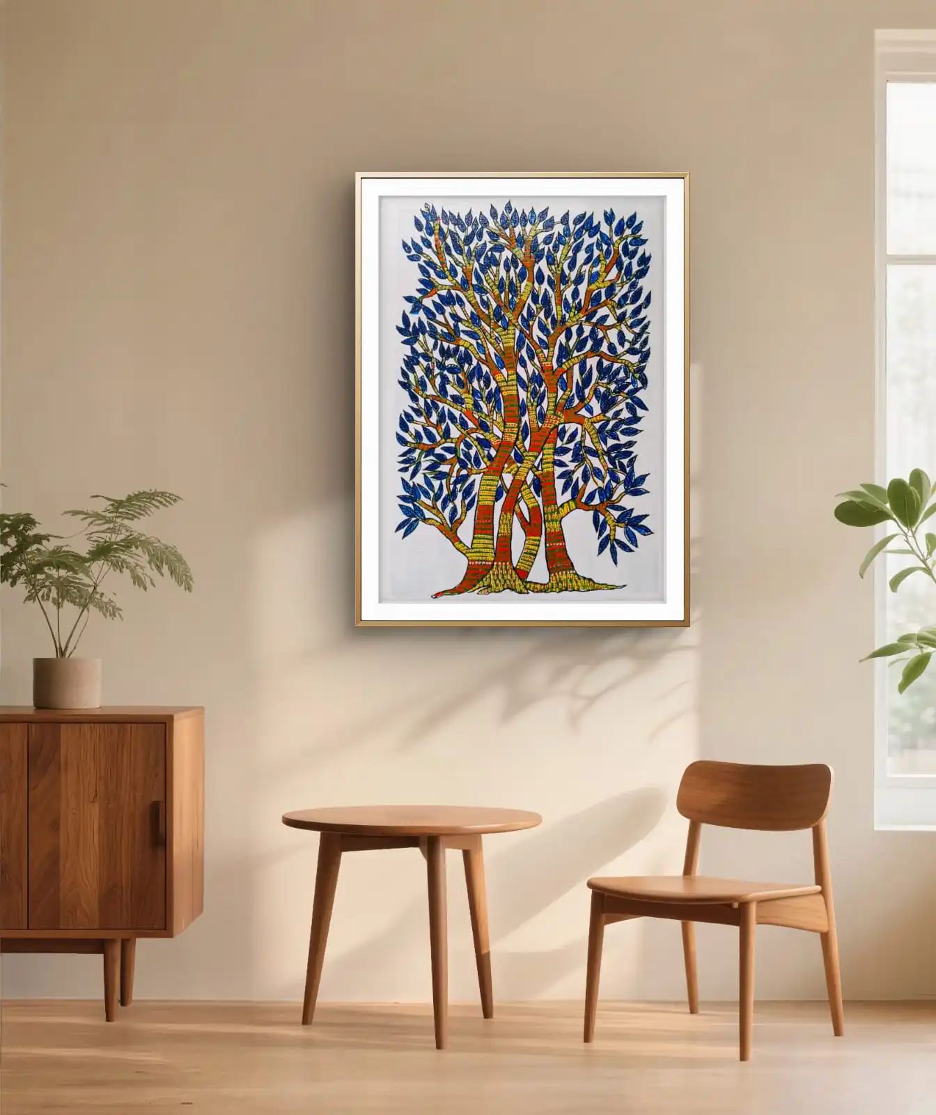 A vibrant Gond folk art painting showing sacred intertwined trees with blue leaves and detailed tribal patterns. Handmade artwork by artist Sabiha Jameel. This Sacred Gond tree life painting is created by artist Sabiha Jameel using acrylic on canvas. The size is 14 × 20 inches and it comes framed, ready to hang. The artwork will be delivered with an authenticity certificate and purchase invoice.