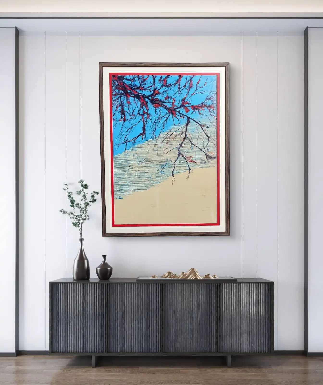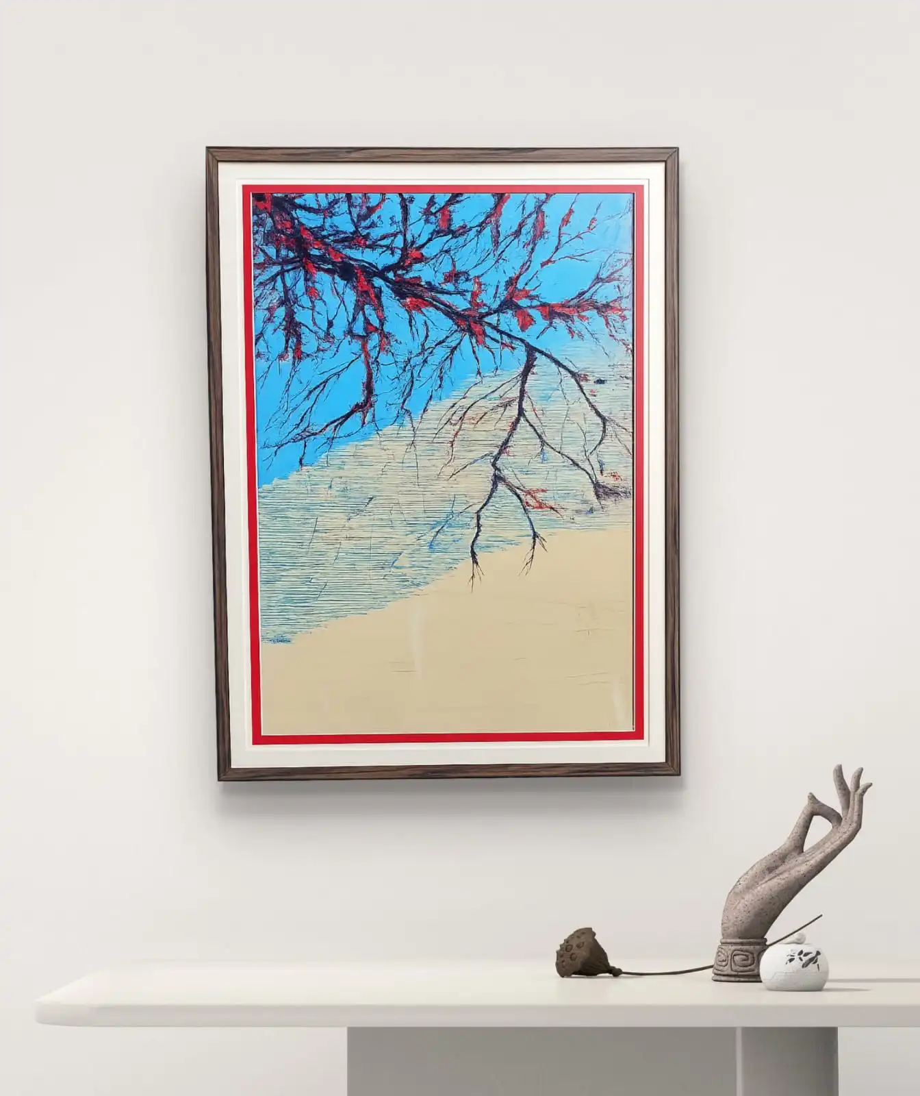 The artist used an acrylic drip technique to form strong red branches on a soft blue background. The flowing lines show motion and new life. The simple form creates a calm and hopeful mood.