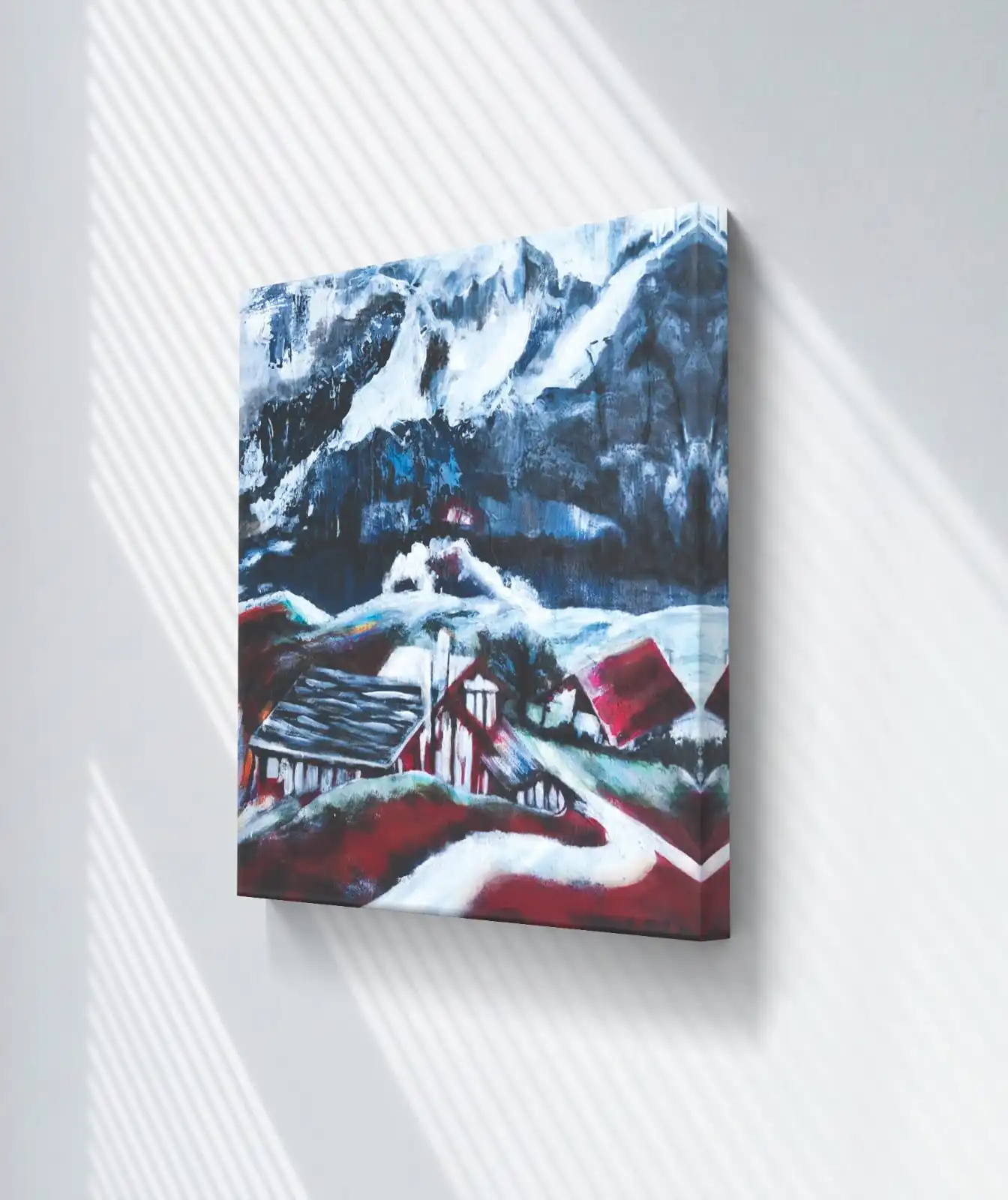 Snow Mountain Village is a calm and detailed acrylic artwork of snowy mountains and village houses. The print comes on premium cotton canvas with classical, gallery, and unframed choices.