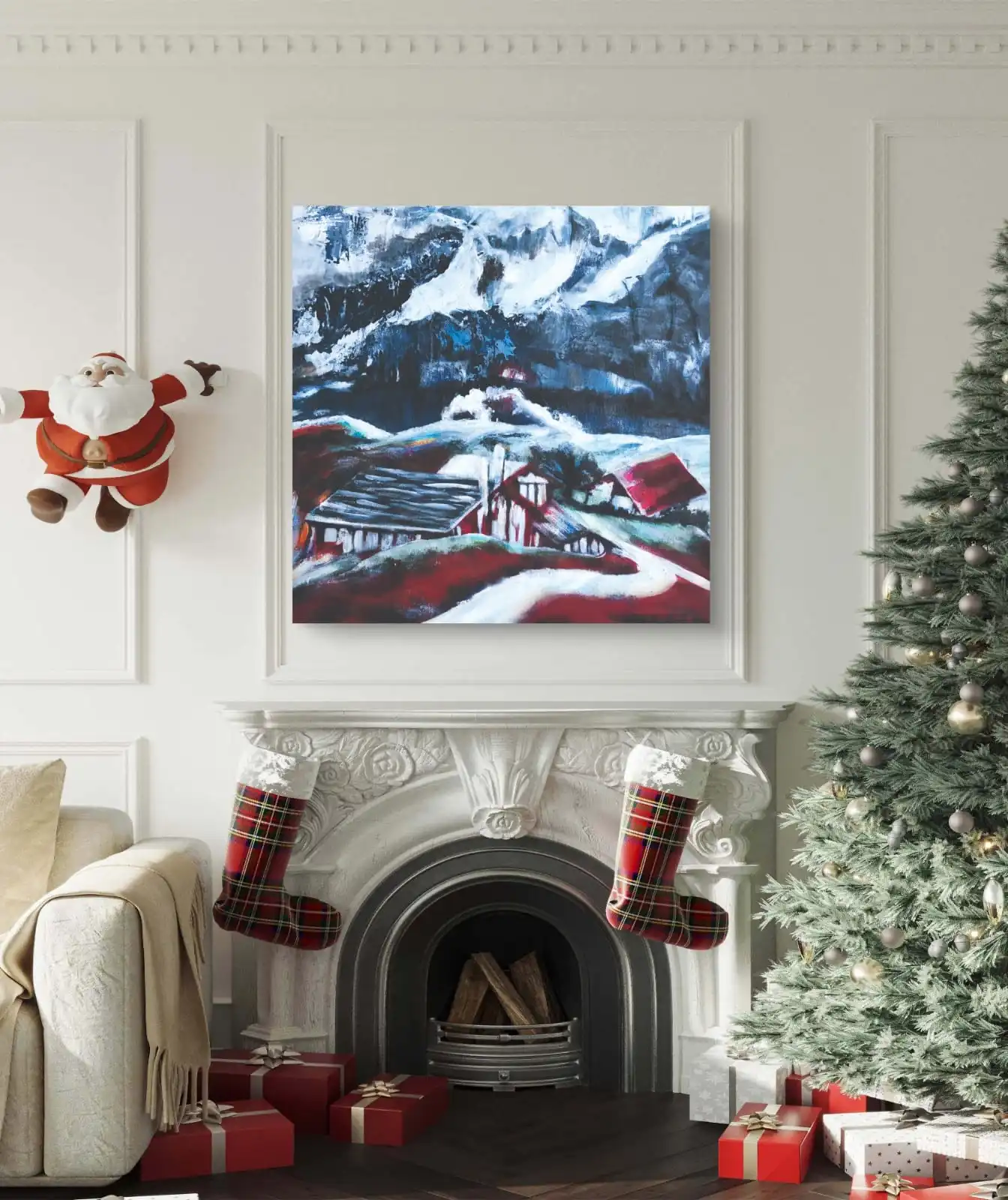 Snow Mountain Village brings the charm of a snowy village to your home. The painting shows clear winter light, soft snow, and cozy cabins sitting under high mountains. The print comes on premium cotton canvas and keeps the textures and color depth of the original artwork.