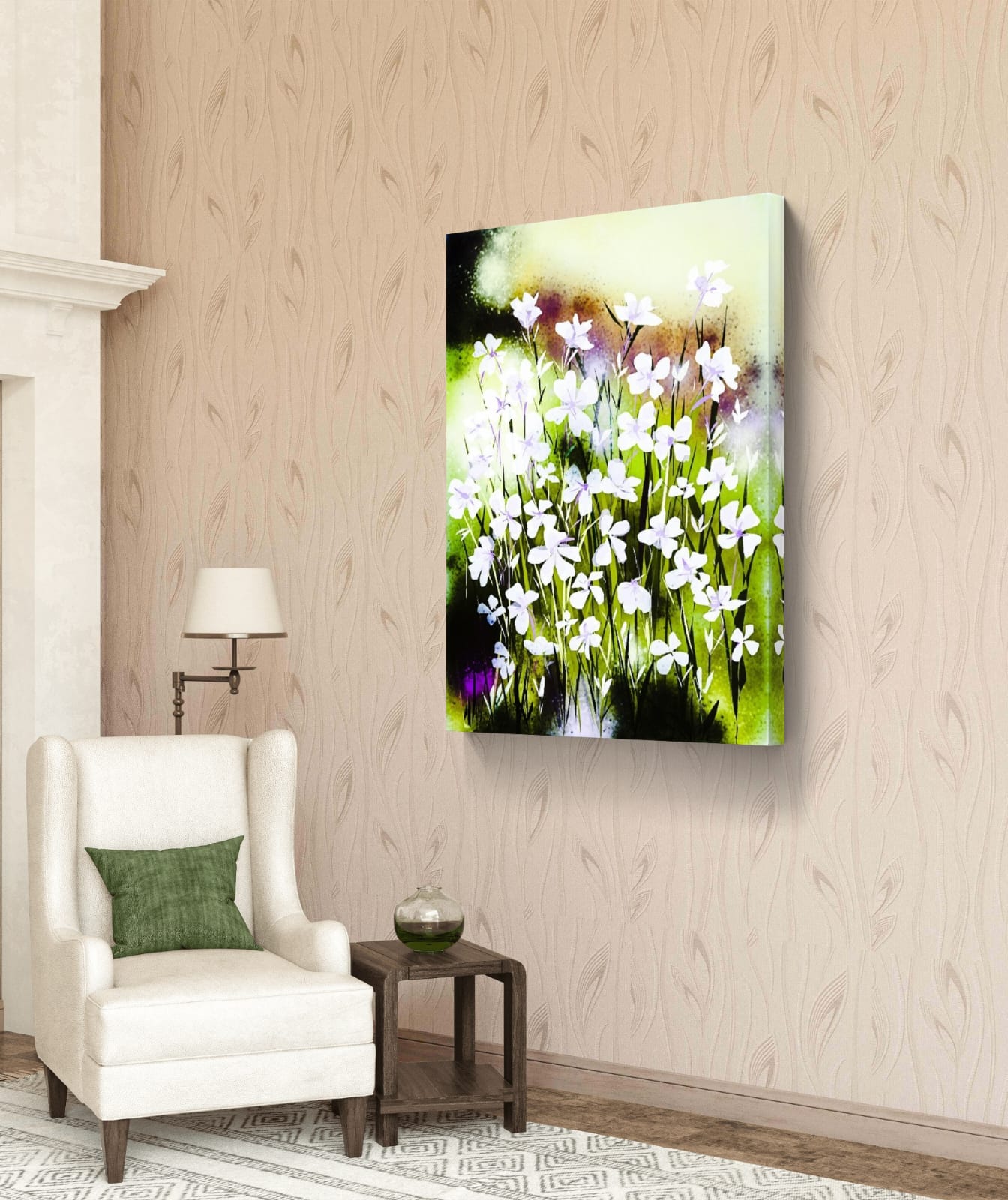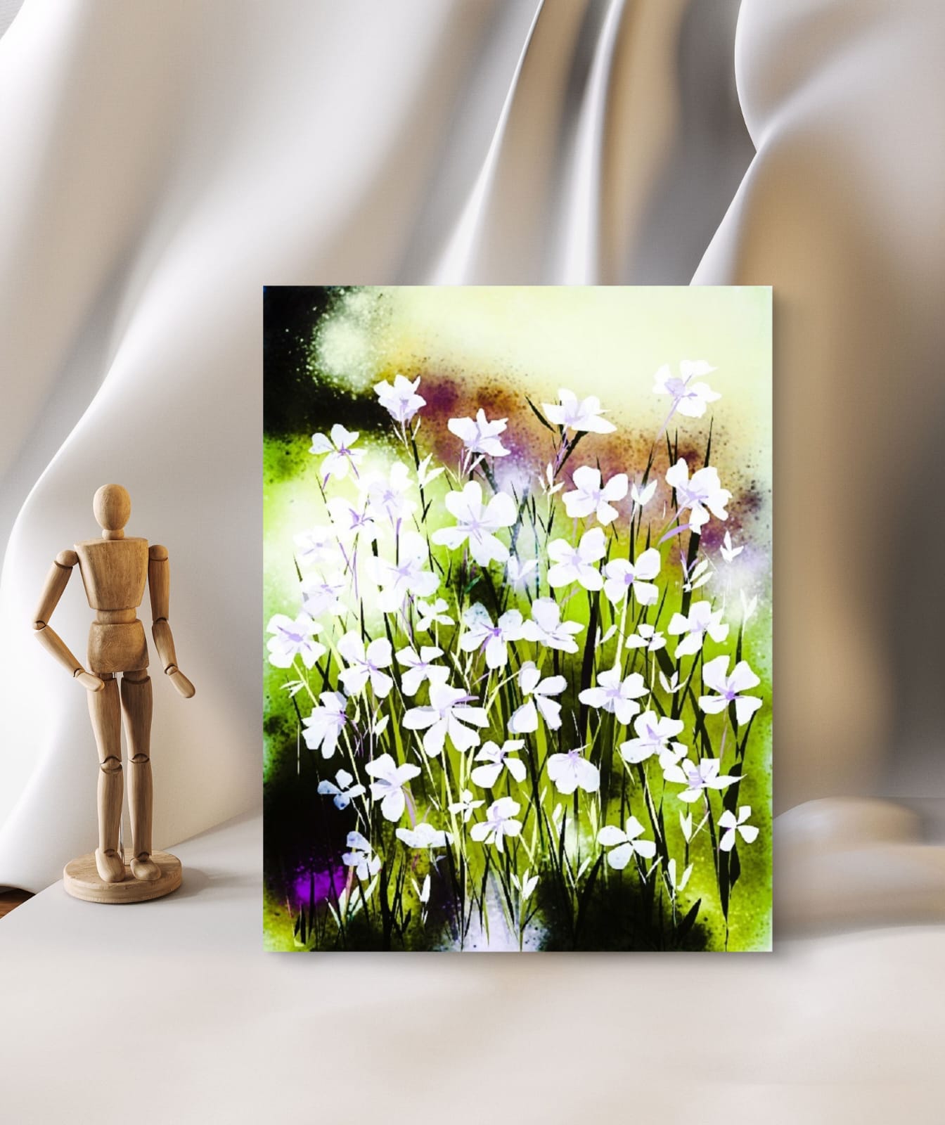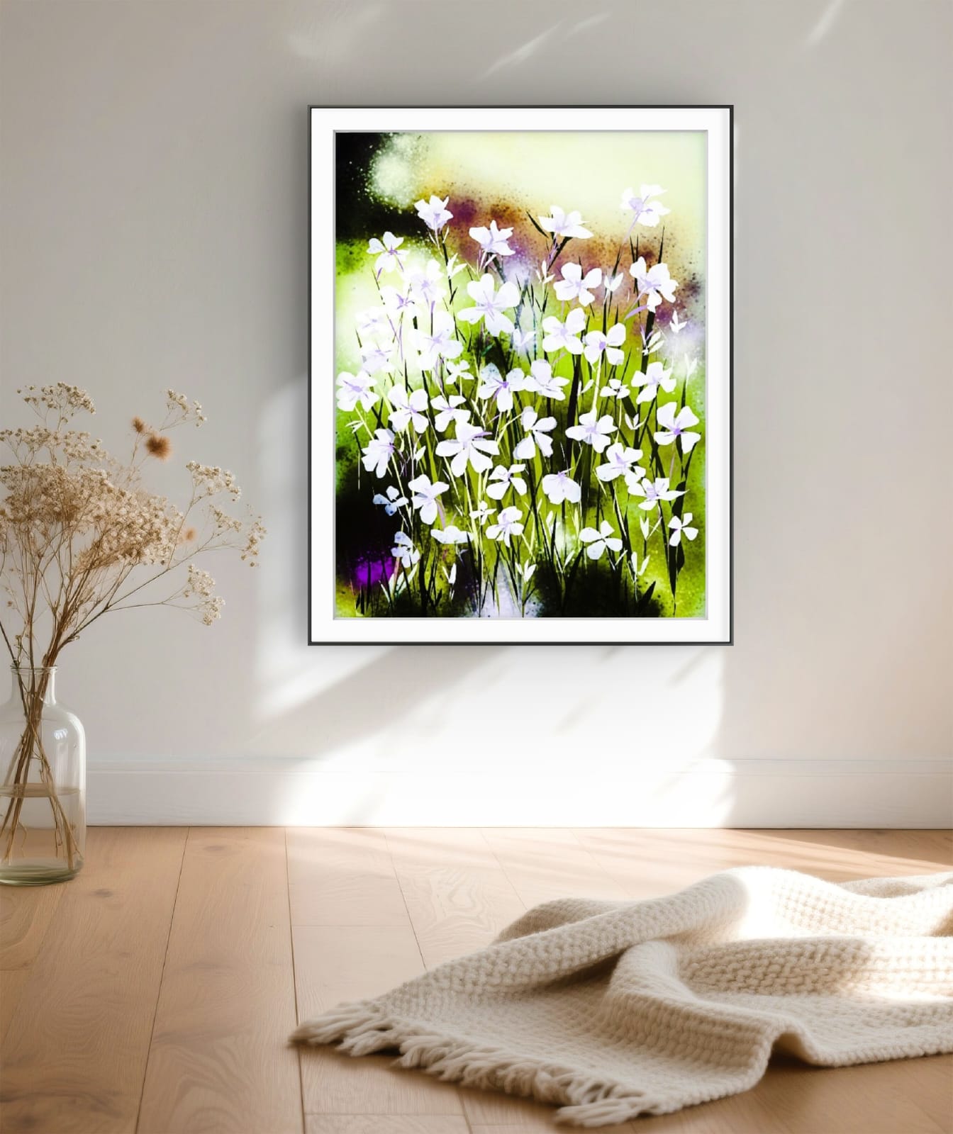 The Snowy Carpet Art Print shows small white wildflowers spread like a soft blanket on the ground. It brings a sense of calm, freshness, and light to your space.