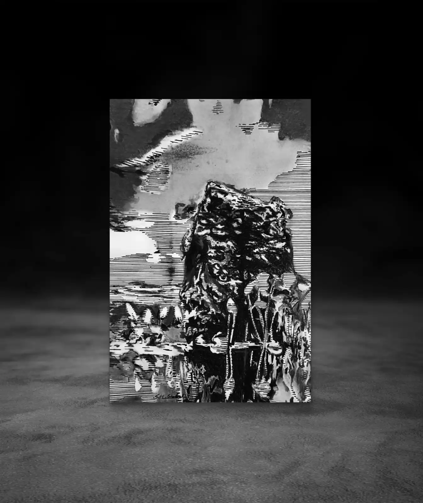 Still Stone Gentle Buds is a monochrome landscape artwork by artist Sabiha Hasan Sumbul. The piece shows a large stone partly under water with gentle flower buds floating around it. Created with pen and charcoal, the artwork captures quiet movement, texture, and the calm mood of nature.