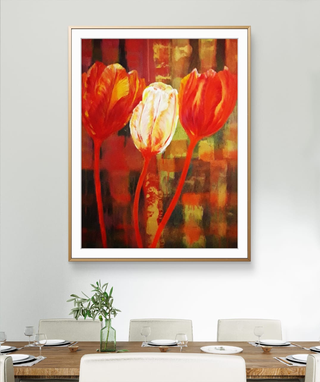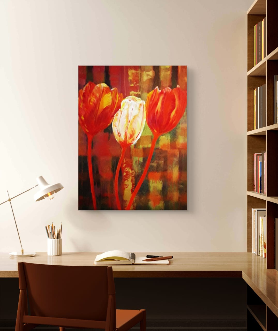 You can choose from three display styles: classical frame, gallery wrap, or unframed. Its vibrant tulips brighten any room, whether it’s your living space, office, or a thoughtful gift for a loved one.