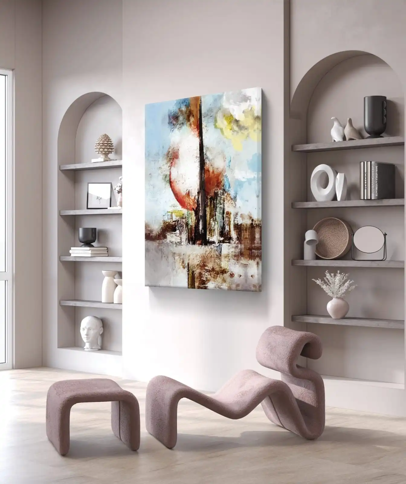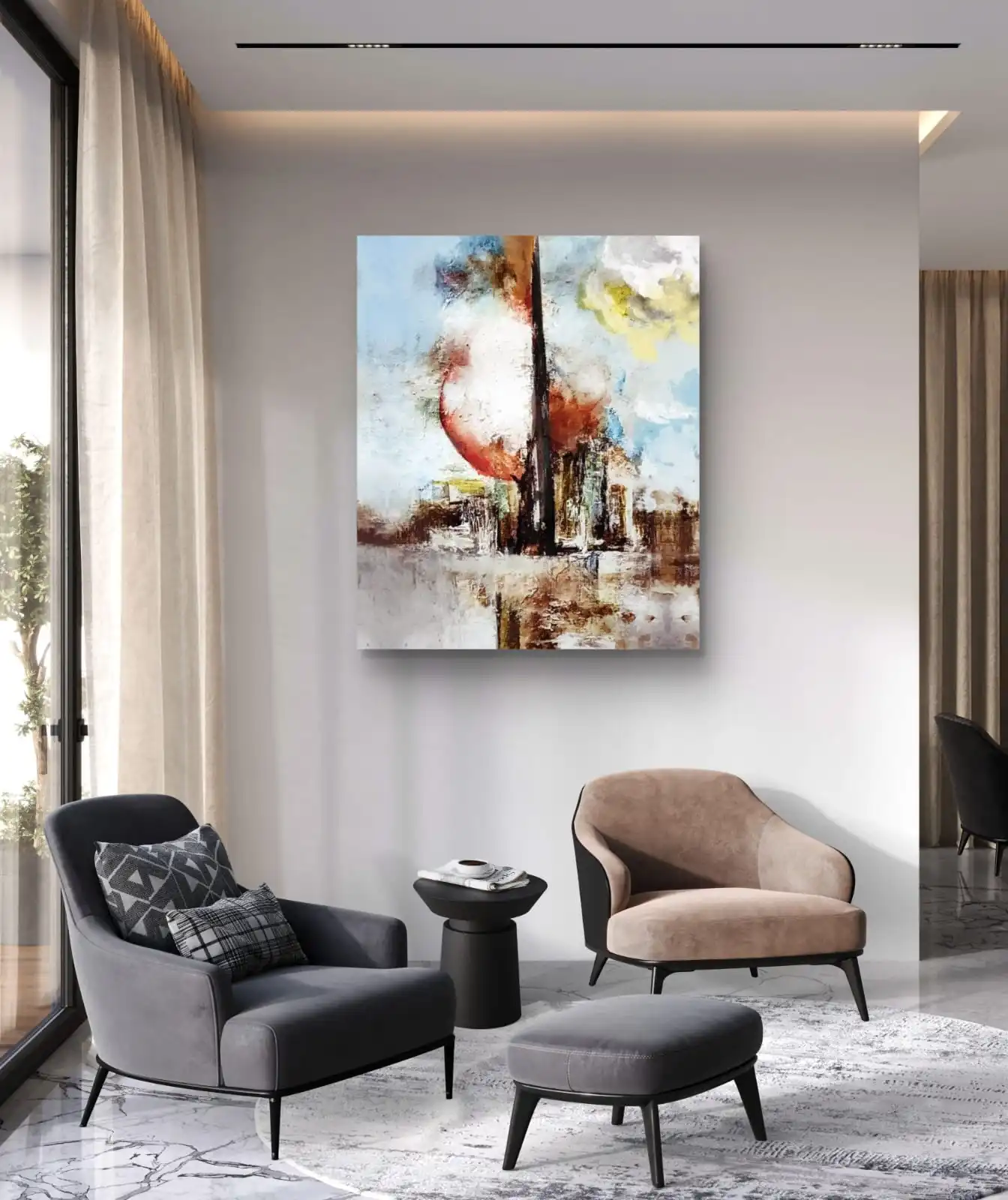 Vertical Dawn abstract painting shows the calm power of light and form. Soft textures mix with rich colors to create peace and balance. The bold vertical line at the center adds focus and strength, like sunlight rising through calm air.
