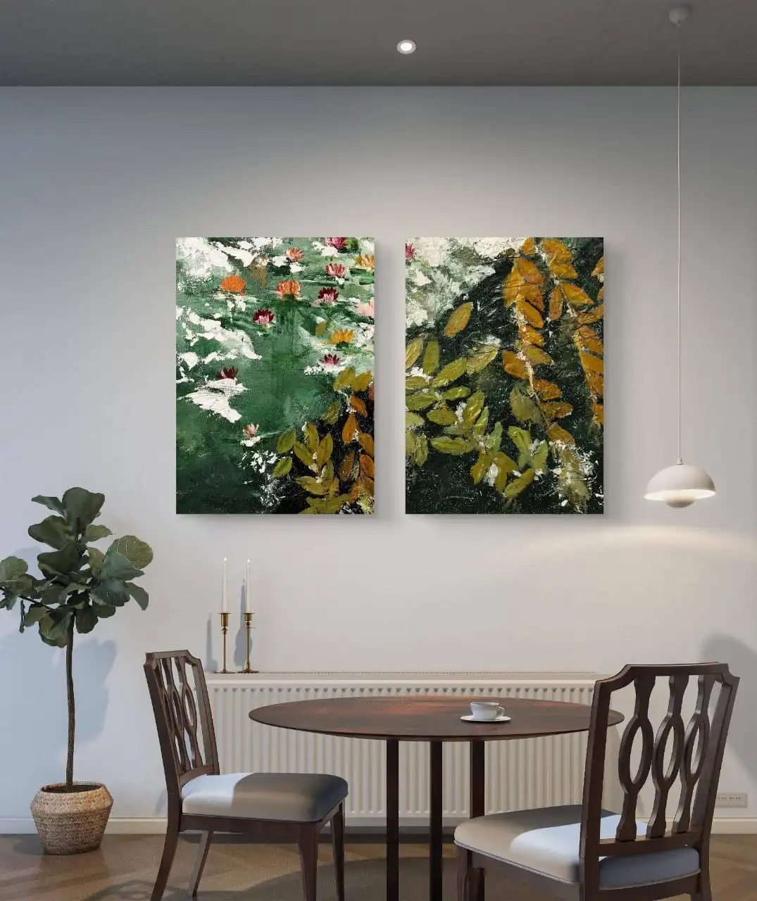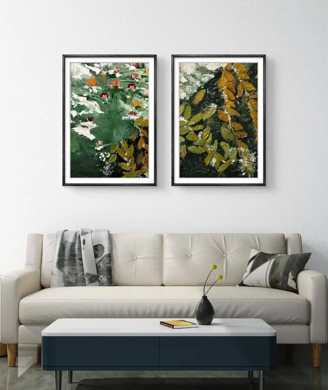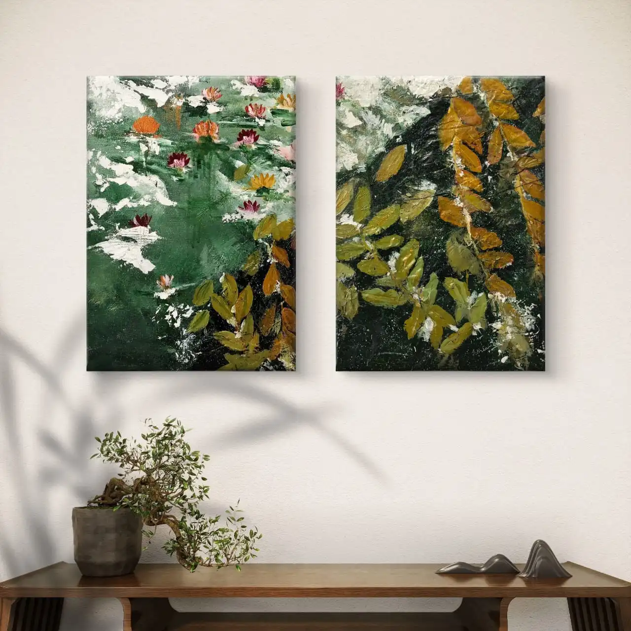 Set of 2 Waterlily Pond Art Prints, handmade in acrylic on cotton canvas by artist Sabiha Hasan Sumbul. Available framed, unframed, or gallery wrap.